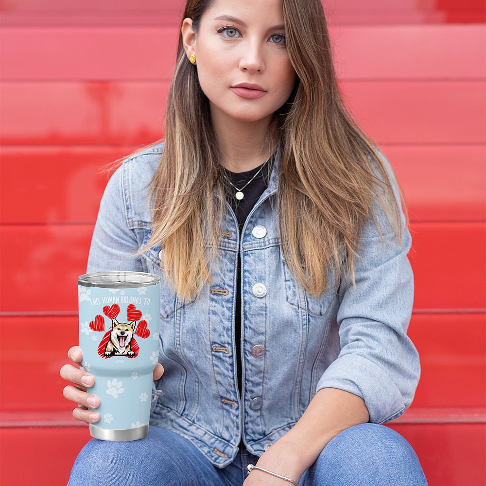 The tumbler features the phrase "This Human Belongs To" accompanied by a charming cartoon pet image. The eye-catching paw print design on the front of the tumbler makes it a delightful gift for pet lovers with a sense of humor.