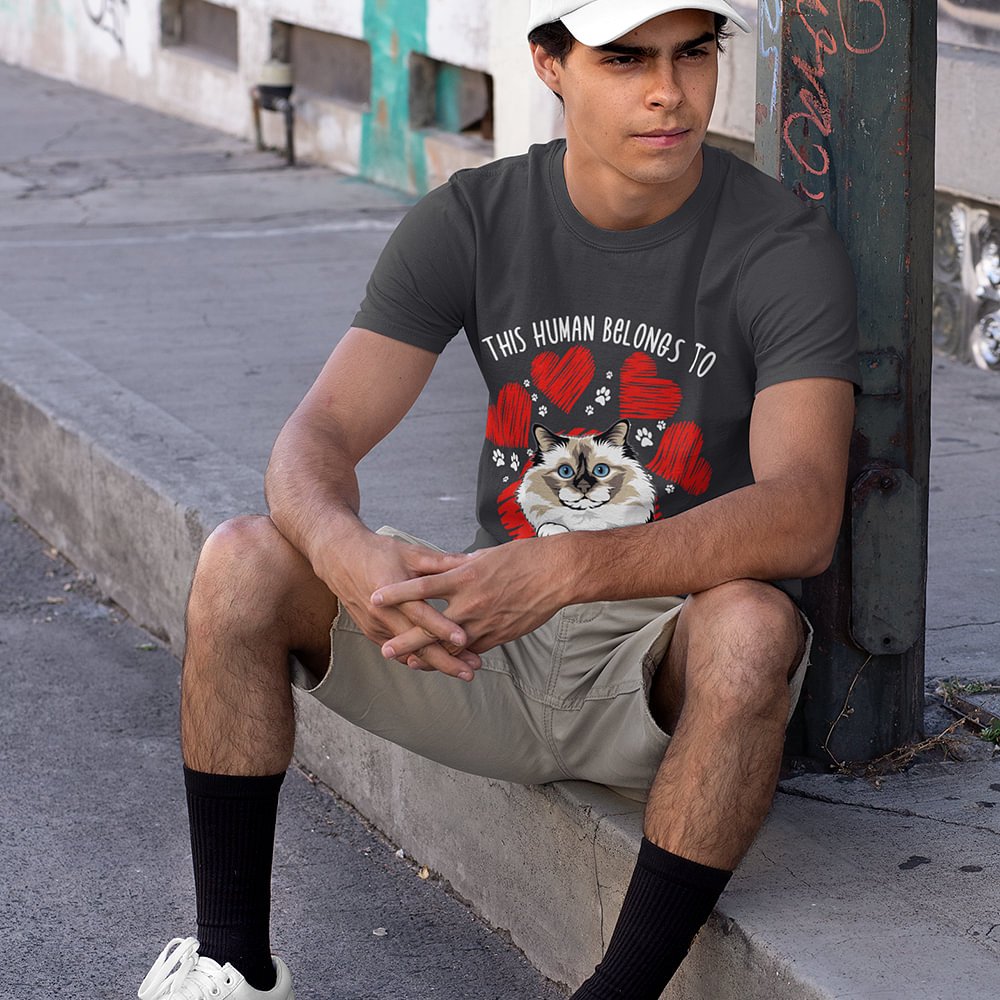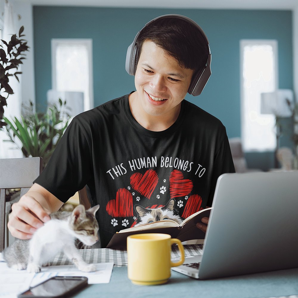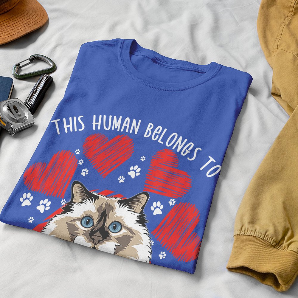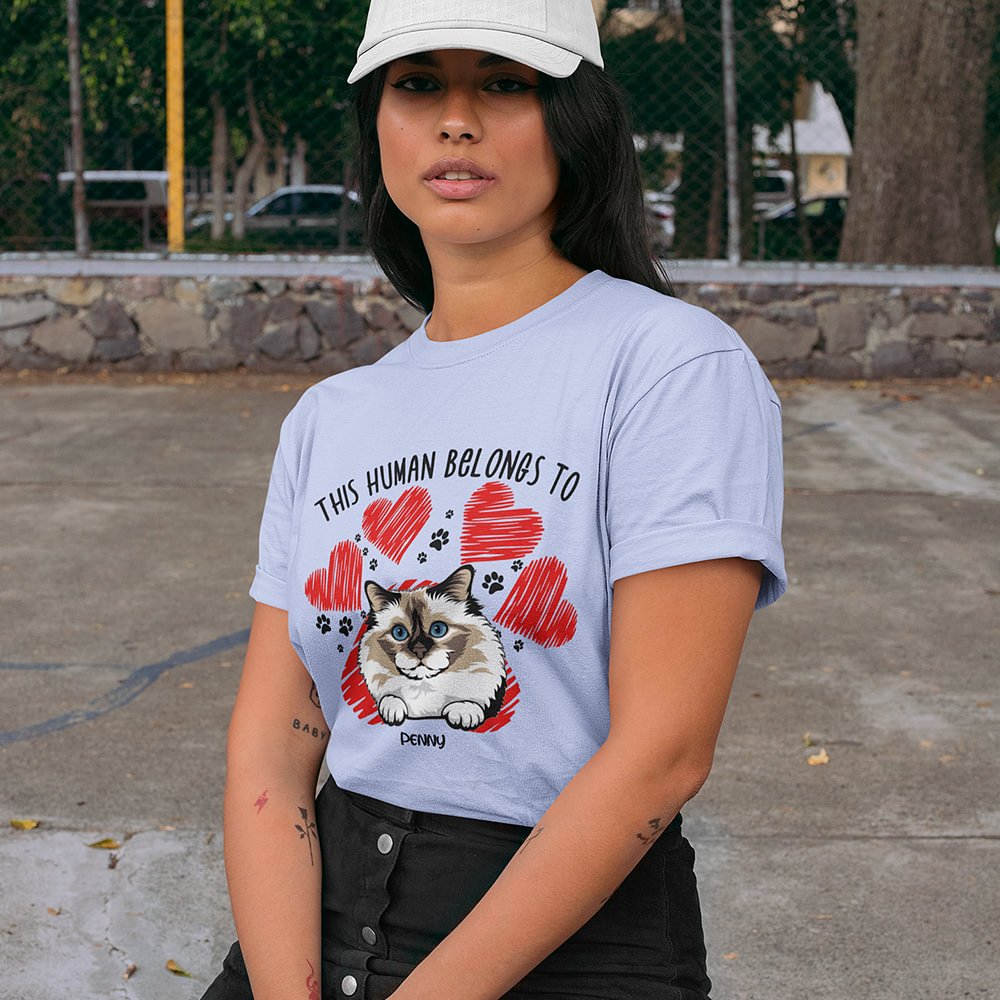 The T-shirt features the phrase "This Human Belongs To" accompanied by a charming cartoon pet image. And the eye-catching paw print design on the front of the t-shirt adds a touch of cuteness and whimsy. It serves as a constant reminder of the joy and happiness your pet brings into your life. With just a few clicks, you can add your pet's name to the shirt, making it truly one-of-a-kind and reflecting the special connection you share.