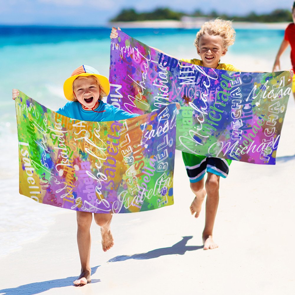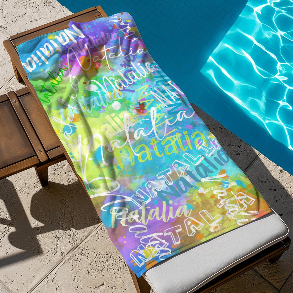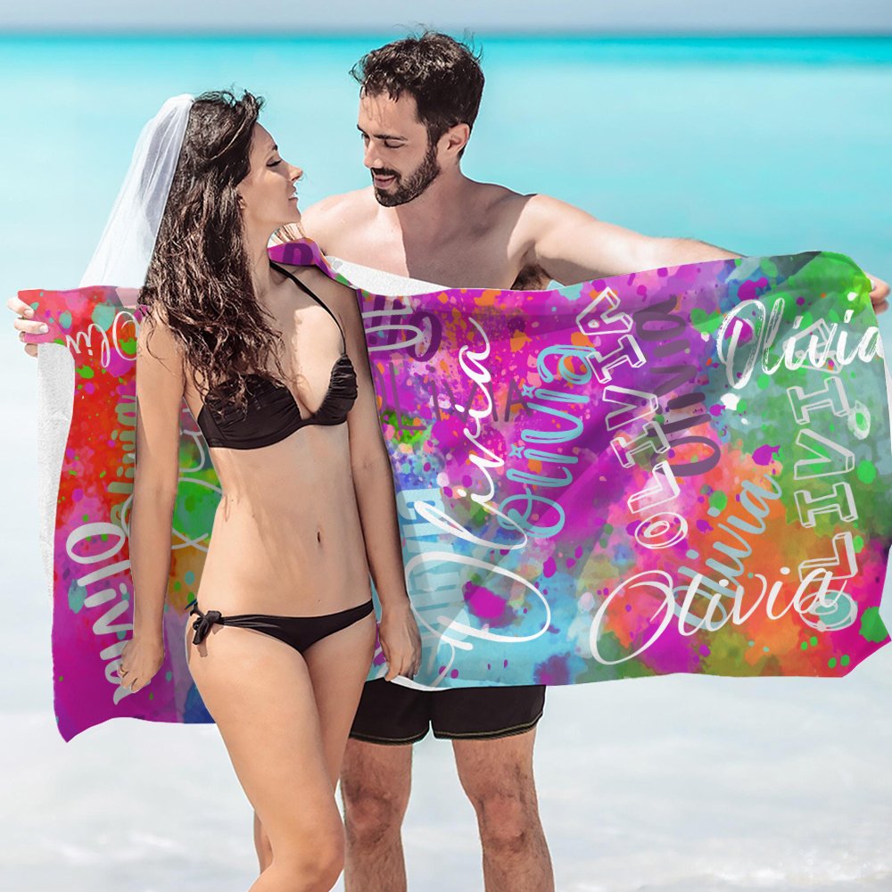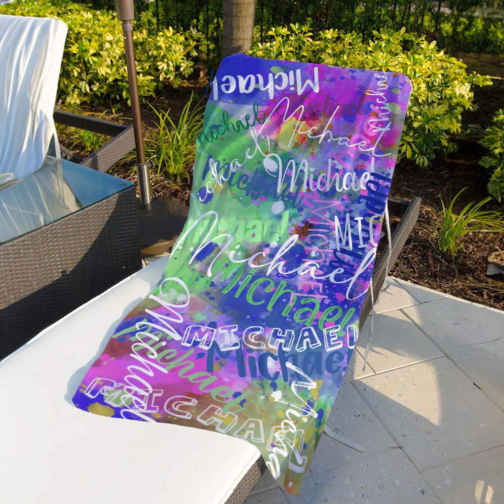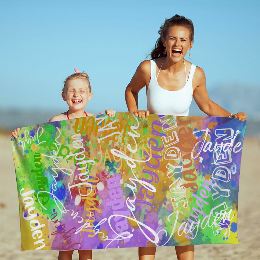 The design of this beach towel is highlighted by a cool tie-dye graffiti effect, showing the name in a word cloud effect, incorporating different fonts to create a unique artistic effect. Users can freely customize the name on the blanket, and the font size and color are randomly distributed, full of layering and fun.