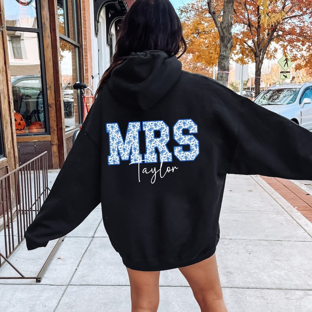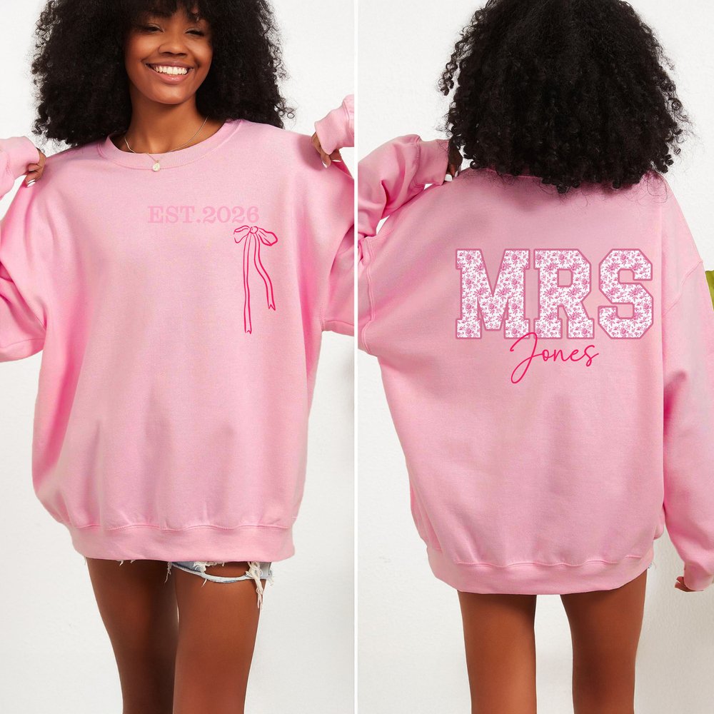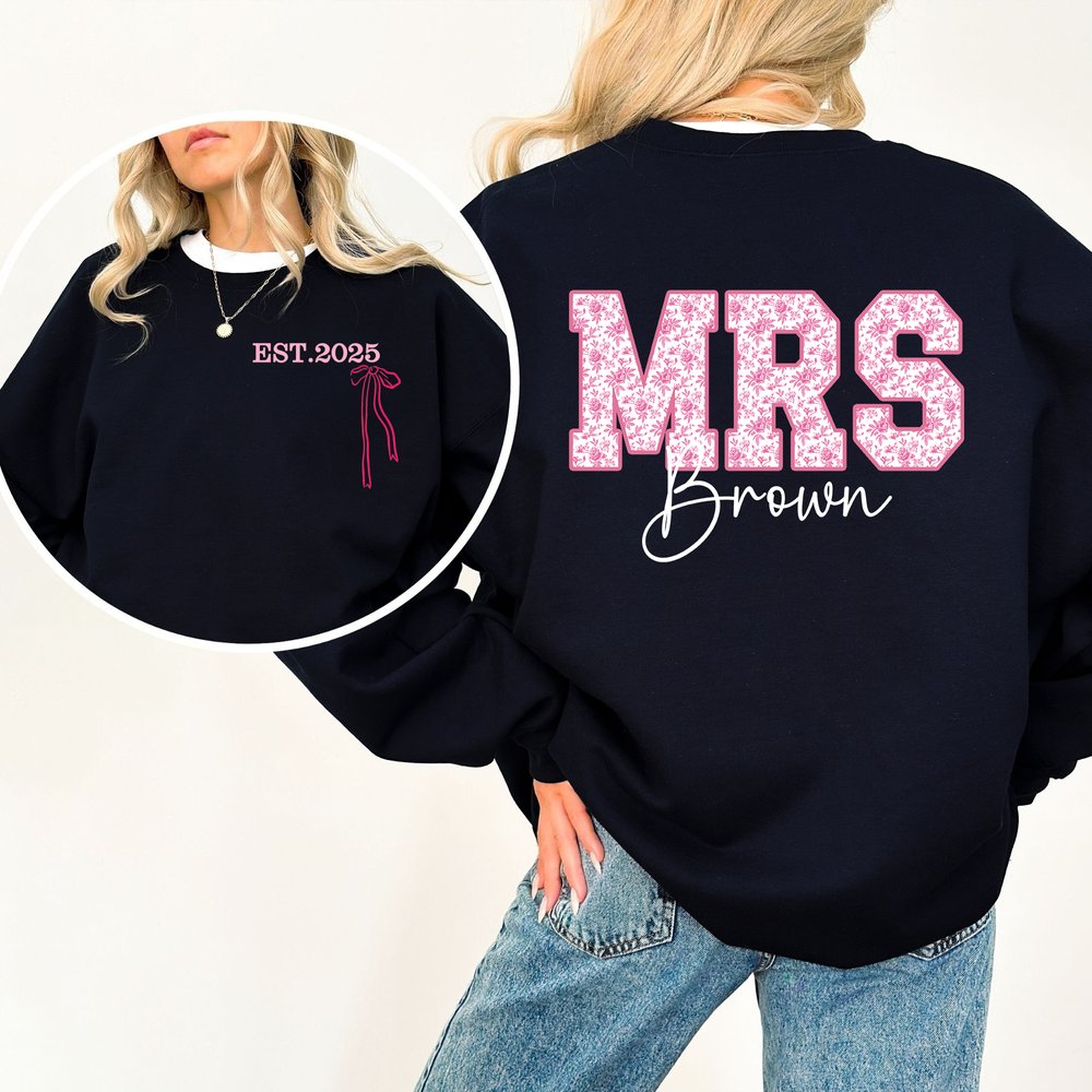 This clothing features an elegant Toile de Jouy style, adorned with enchanting floral patterns and delicate bows, showcasing a unique feminine charm. Printed with a large "MRS" and a personalized surname, it perfectly captures the essence of newlywed identity, allowing every bride to shine on her special day. Each wear celebrates the beauty of new beginnings, highlighting the wearer’s personality and confidence.