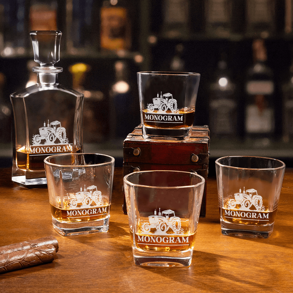 This stunning whiskey decanter features a charming tractor design, perfect for agriculture enthusiasts. Customizable with names, it adds a personal touch that highlights the recipient's love for farming and fine spirits.