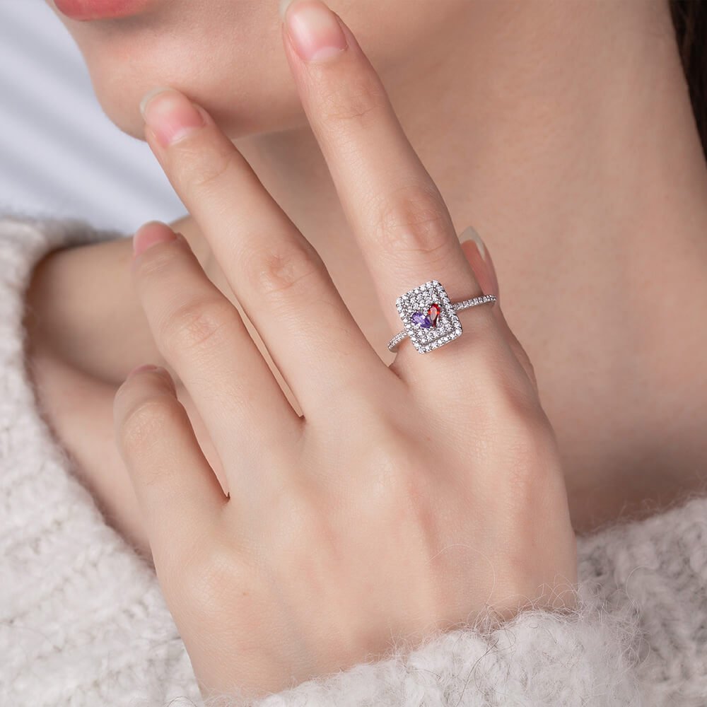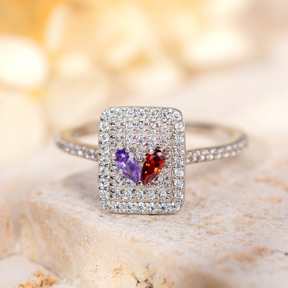 •The shimmering crystals inlaid on the ring band highlight the two birthstones in the middle, standing for true love. This ring can add a delicate tone to your fingers and match all outfits, refined and elegant.