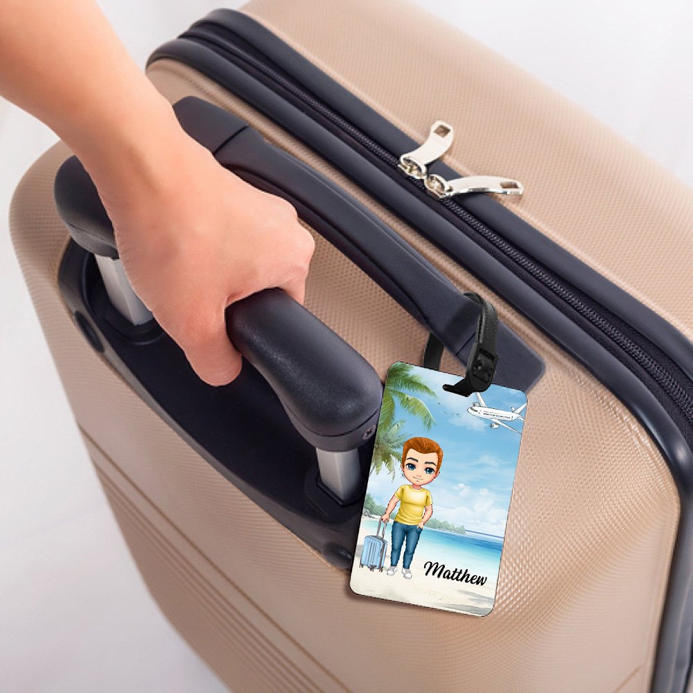 This luggage tag is full of travel and vacation elements. The luggage tag is printed with cute cartoon characters, with background patterns such as beaches, palm trees, suitcases, airplanes, etc., giving people a relaxed and pleasant feeling. The name can also be customized on the luggage tag, making each product unique.