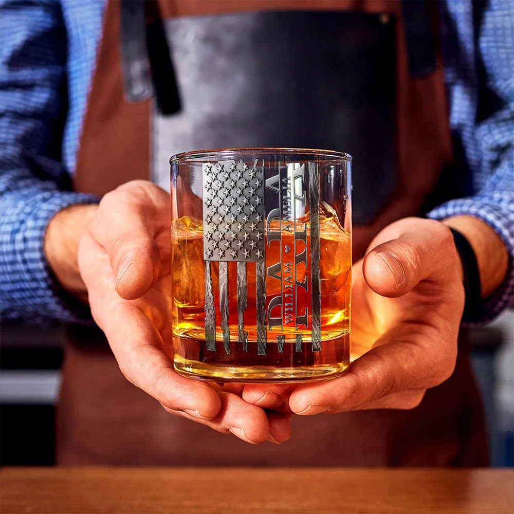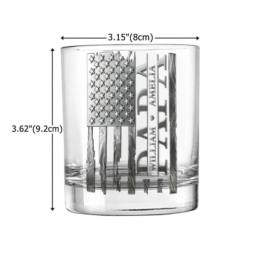 Personalized Vintage American Flag Design 10 oz Rock Whiskey Glass with 1-6 Names Father's Day Birthday Gift for Men Whiskey Lovers