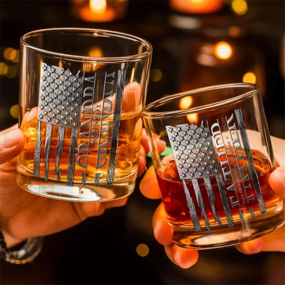 This whisky glass is centered around American vintage style and family sentiment. It features an aged American flag design with star and stripe elements and a worn texture, exuding a vintage and rugged vibe. It can be customized with 1-6 names, perfectly blending with the flag pattern to highlight family identity and honor.