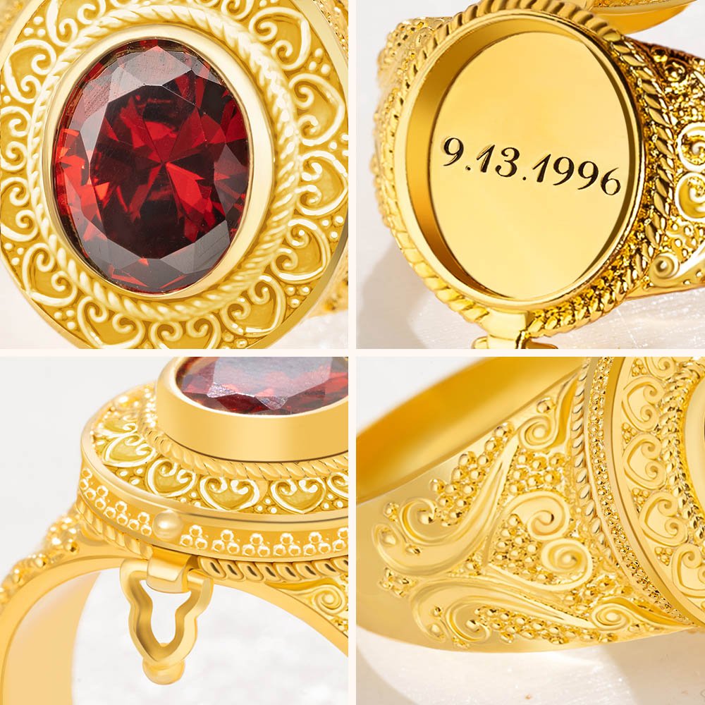 The ring opens with a hinged lid to reveal a tiny hidden compartment inside—a signature feature of traditional poison rings. This clever space can be engraved with a secret message or used to store a mini photo, meaningful note, locket of hair, tiny pills, or even scented balm. It’s a deeply personal accessory that holds hidden treasures and whispers of stories.