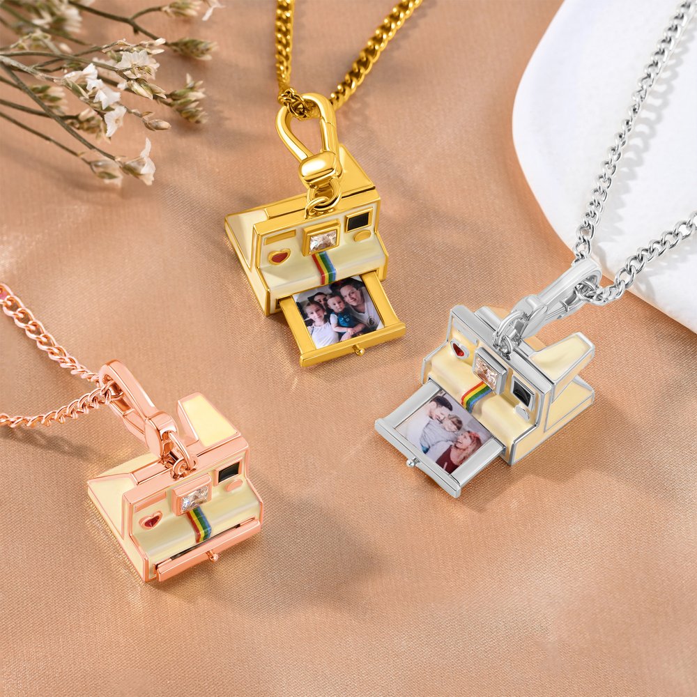 This necklace draws inspiration from a vintage camera design, delicately recreating the iconic look and classic details of an instant film camera. The pendant center can be customized with a personal photo, seamlessly blending cherished memories with fashionable accessories, transforming recollections into a wearable symbol of individuality.