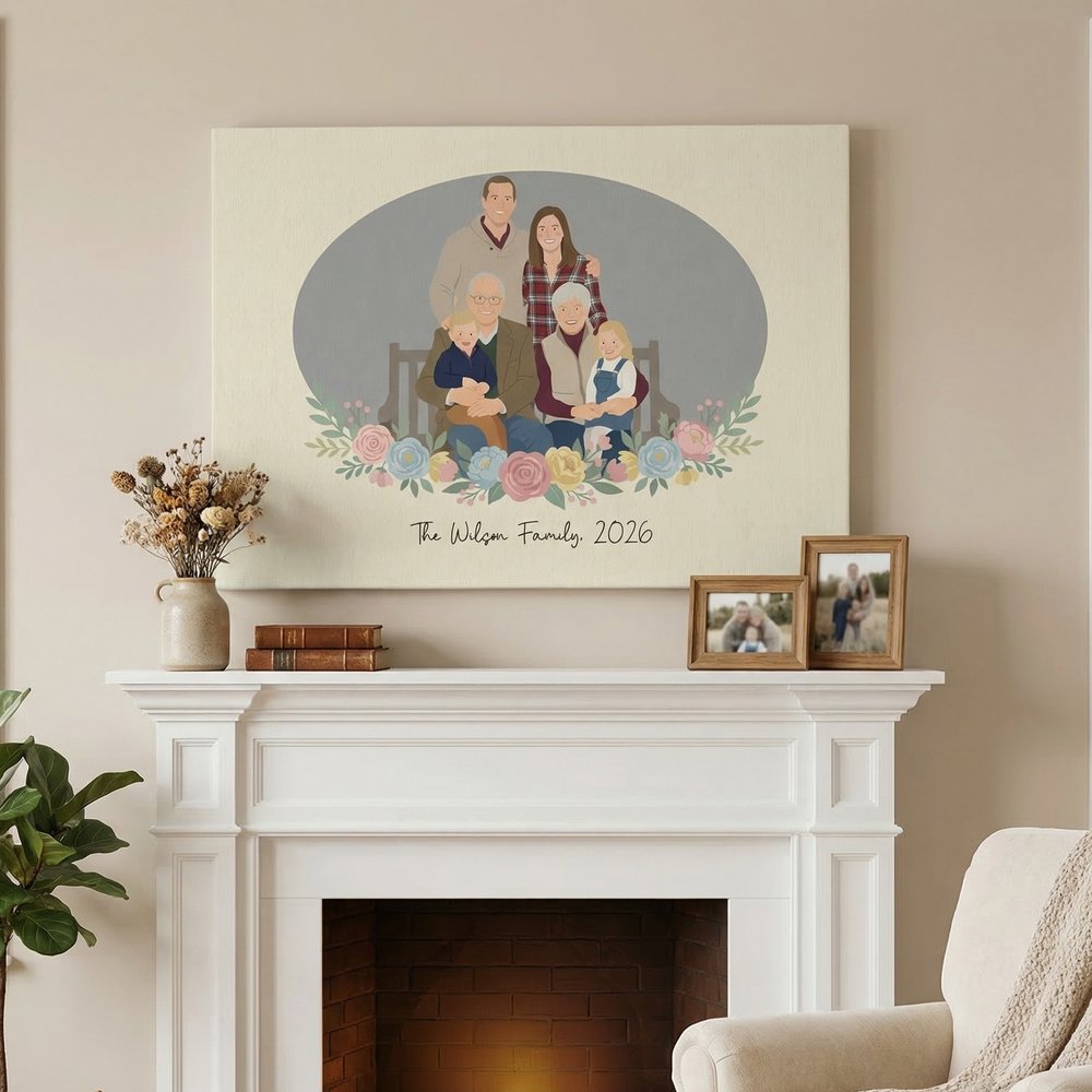 Featuring a modern, flat, hand-drawn style, the images delicately depict the expressions of multiple portraits. Customizable text is available at the bottom, and two formats are available: wrapped canvas prints and floating frame canvas prints. The design is simple yet highly artistic. The image seamlessly extends around the edges for a clean, 3D minimalist look—ideal for a sleek, contemporary aesthetic.