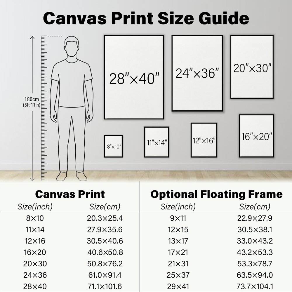 For the best Giclee print quality, please upload high-resolution original photos (we will contact you if the resolution is too low). Keep important details, such as faces or text, at least 1.5 inches from the edges, as they will wrap around the frame. Please measure your wall space before ordering, since room mockup images are for display purposes only. For split prints or gallery wall displays, we recommend leaving about 2 to 3 inches of space between each piece for a balanced and visually pleasing arrangement.