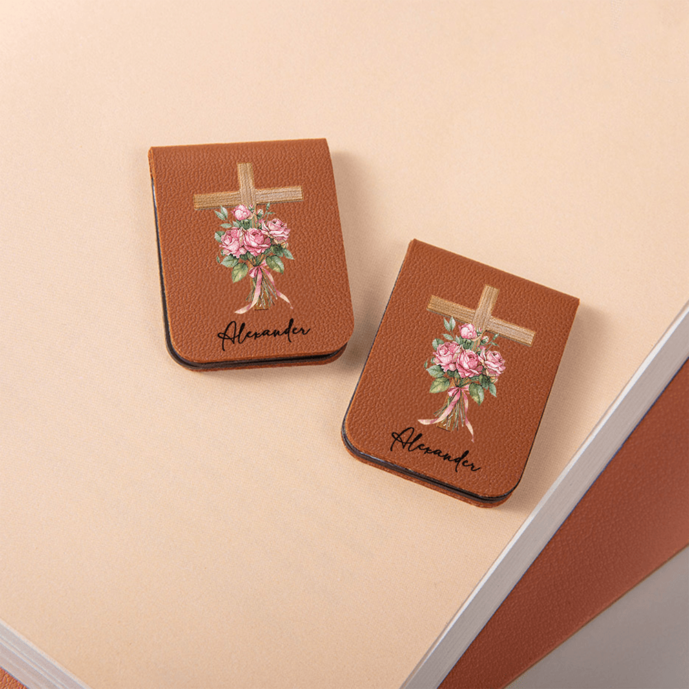 Personalized Watercolor Birth Flower Cross Magnetic PU Leather Bookmark Clip with Name Birthday Gift for Book Lovers Bookworms