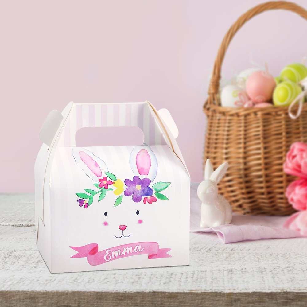 The front of each box is adorned with a cute bunny face, with big pink or blue ears and a sweet, smiling expression. Surrounding the bunny is a beautiful watercolor floral arrangement with vibrant purple, pink, and yellow flowers. This design gives the boxes a fresh, spring-like feel, perfect for Easter celebrations.