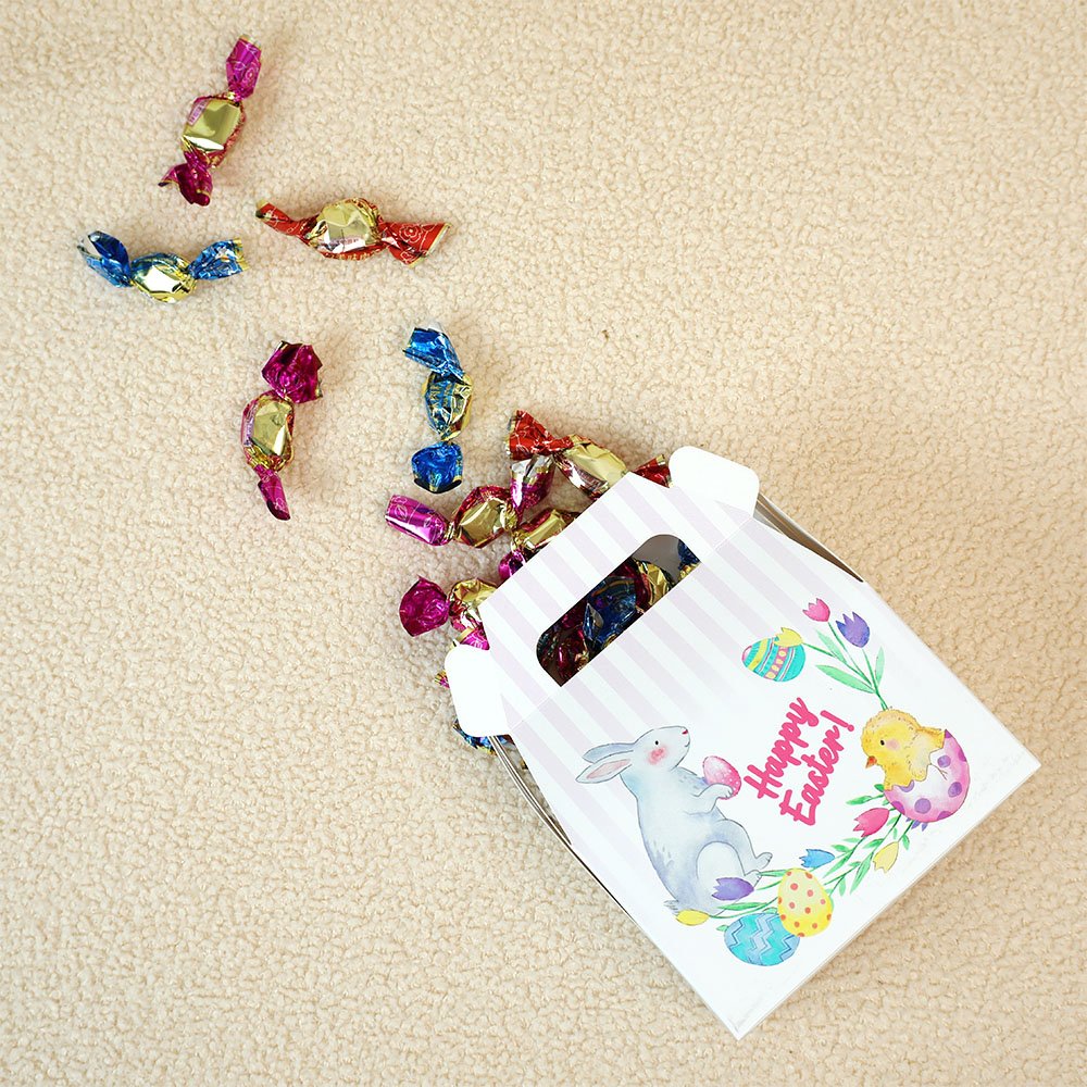 The boxes are filled with Easter-themed elements. In addition to the bunny and flowers, Easter eggs are depicted on the boxes. Boxes back have messages like "Happy Easter!" which further emphasize the festive nature of these treat boxes. These elements create a joyful and celebratory atmosphere.