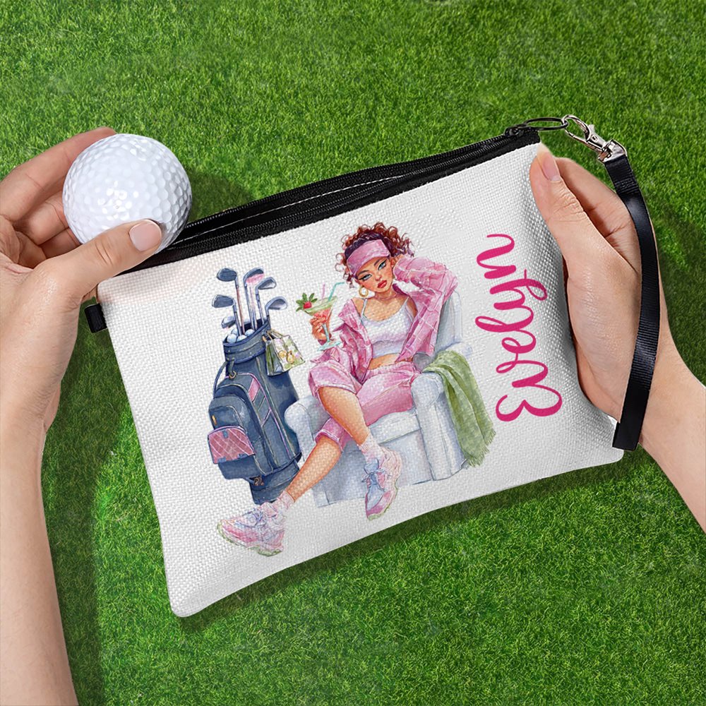 Personalized Watercolor Fashion Golf Character Name Makeup Bag with Wrist Strap Daily Use Christmas Birthday Gift for Women Golf Players Lovers