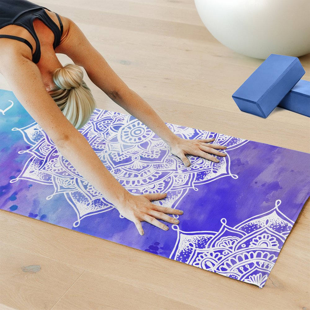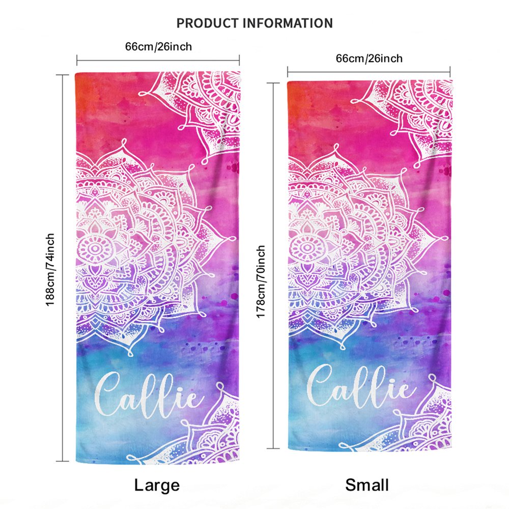 This yoga towel features a watercolor background with a mandala flower theme, blending elegance with vitality. Its unique design is not only visually appealing but also inspires you to maintain focus and inner peace during each yoga practice. Each towel showcases the perfect combination of art and movement, and the option for a customized name makes it an extension of your personal style.