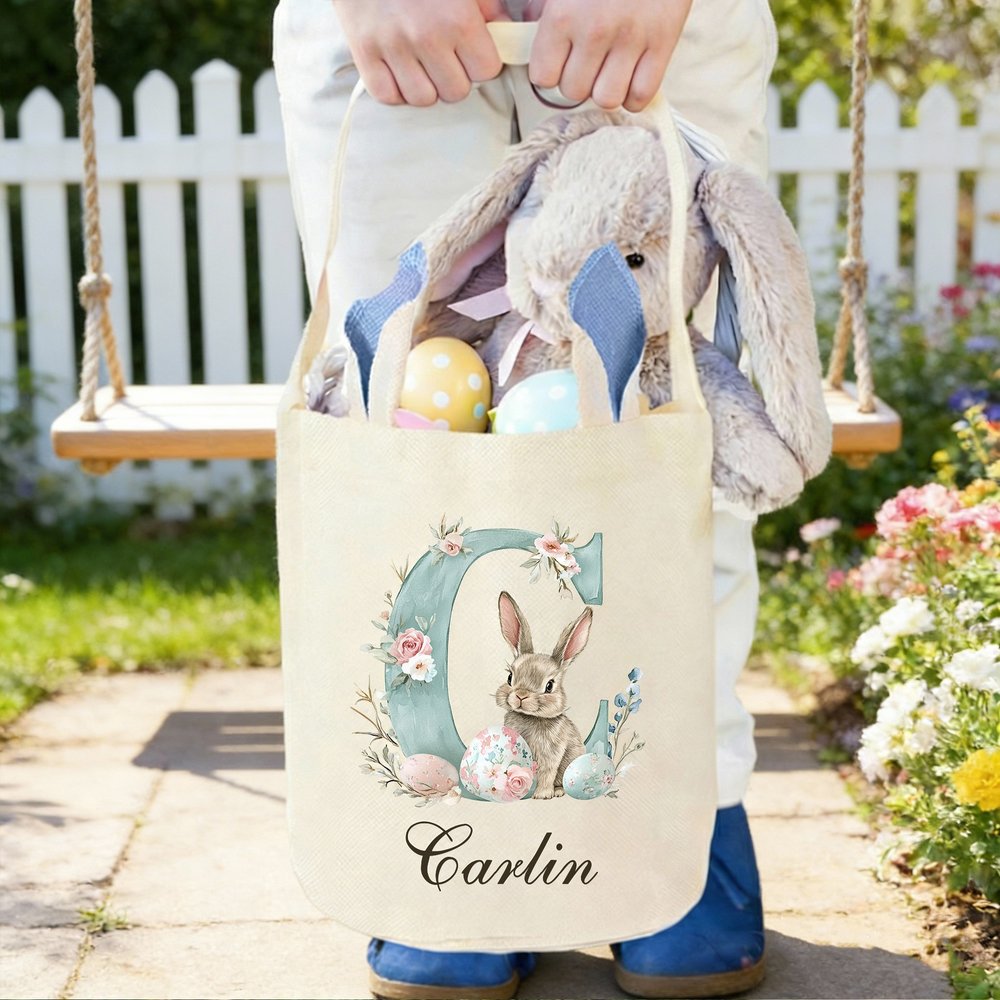 This basket features a watercolor-style design, incorporating an adorable rabbit, pastel flowers, Easter eggs, and an initial. The 3D bunny ears add a touch of freshness and gentle festive cheer, perfectly capturing the hearts of both boys and girls. Customization with initial and name is available, making each basket a unique holiday accessory for your kids.