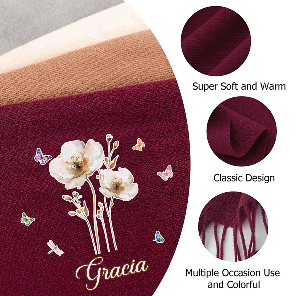 Featuring watercolor floral motifs adorned with fluttering butterfly accents, this piece is further enhanced by customizable monogramming. Paired with delicate fringe detailing, it exudes romantic charm and thoughtful craftsmanship. Infuse your autumn and winter wardrobe with artistic flair—a statement piece that stands out from the crowd while subtly revealing your personal touch. Transform your essential layering piece into a signature style statement.