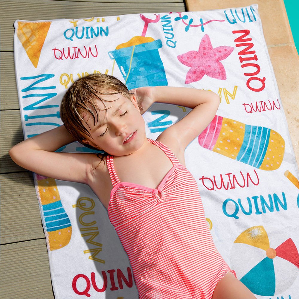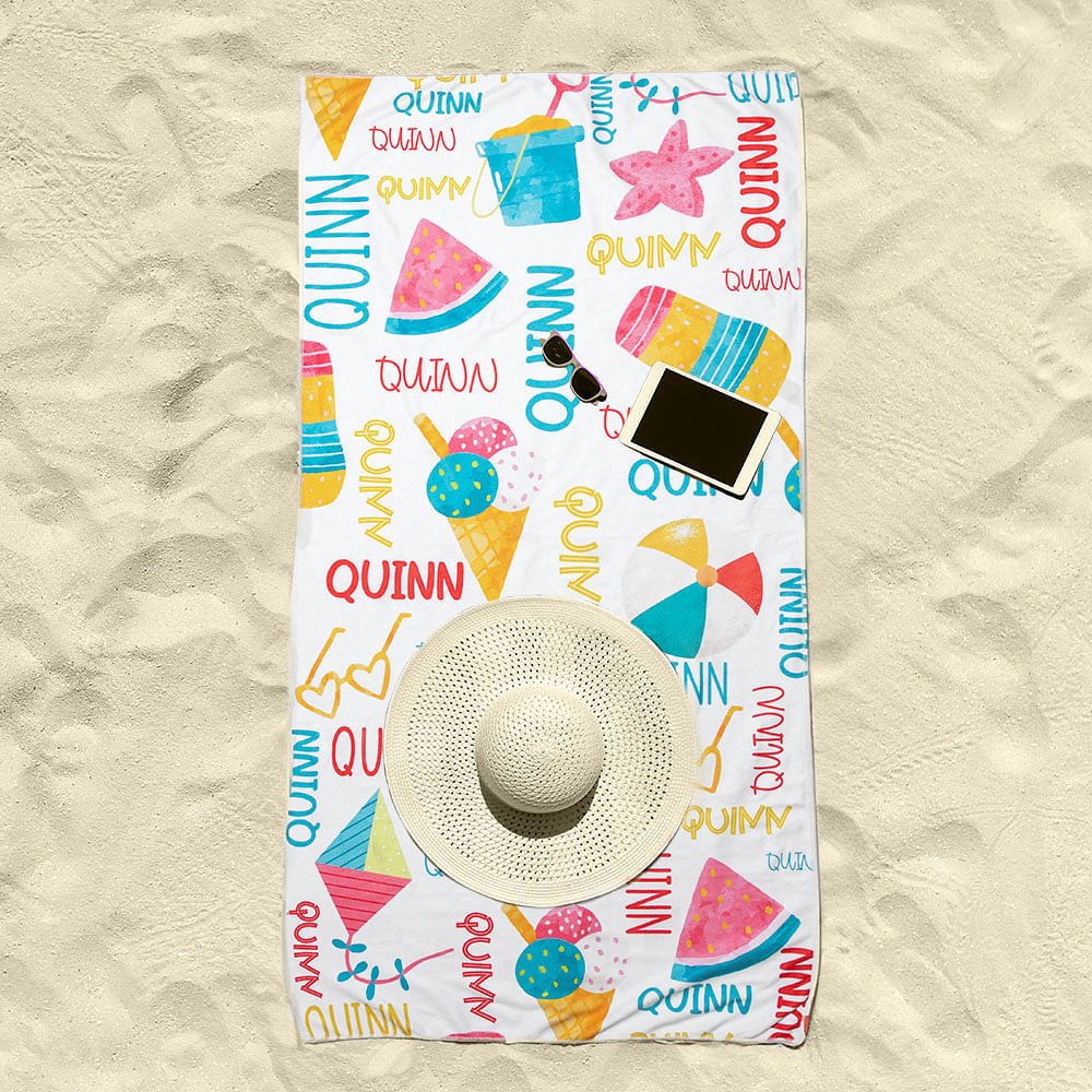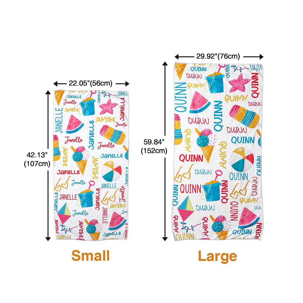 The beach towel features a delightful array of beach-themed patterns, including ice cream cones, beach balls, kites, sand buckets, and shovels. Its vibrant colors evoke the joy and energy of summer, making it a fun and stylish accessory for your little ones.