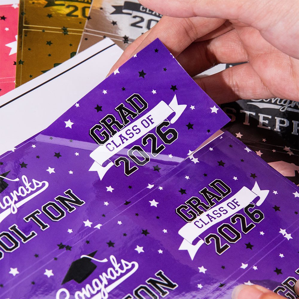 Utilizing a special technique, our stickers feature a reflective mirror effect that enhances the visual appeal of your graduation party. The labels reflect light beautifully, creating an eye-catching atmosphere.
