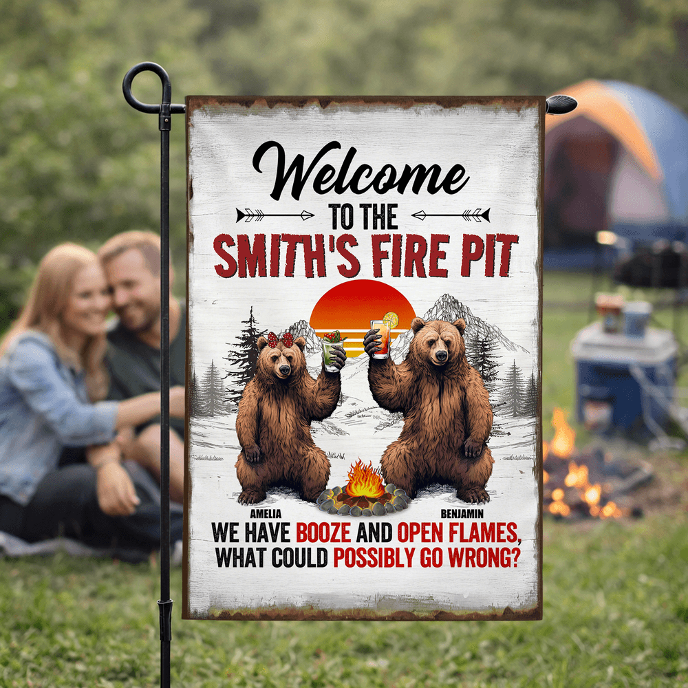 Drawing inspiration from the family, this custom garden flag serves as a vintage tribute to family unity. The design features charming bears holding drinks around a campfire. You can personalize this piece by choosing cubs, adding bows, and selecting specific beverages like cocoa. These elements transform a standard flag into a unique narrative.