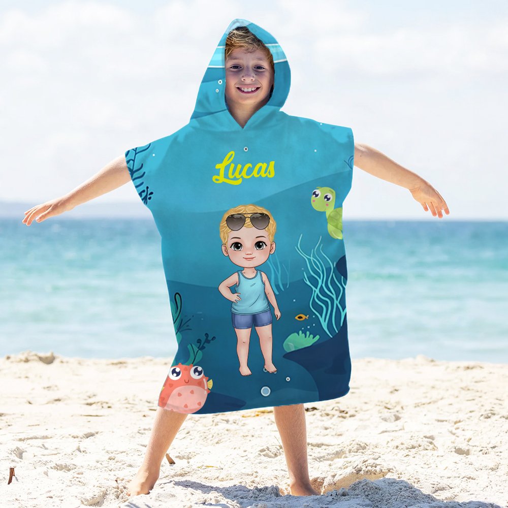 This hooded beach towel features adorable ocean animals, including whales, dolphins, sea turtles, jellyfish, and more. With a magical underwater backdrop, it invites children to explore the wonders of the sea while meeting these charming marine creatures. You can also personalize it with your child’s name, making it a one-of-a-kind beach essential.