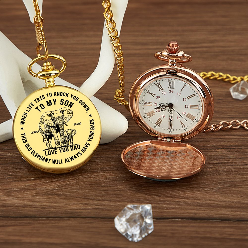 We proudly present the "When Life Tries to Knock You Down" pocket watch, featuring a unique design that symbolizes unity and strength, conveying unwavering support. You can customize the watch's color, name, pattern, and text, turning it into a warm blessing that carries your love and encouragement. It serves as a constant reminder that no matter what challenges he faces, he has your presence by his side.