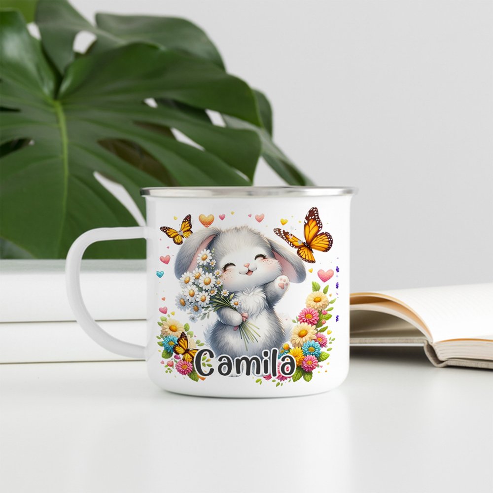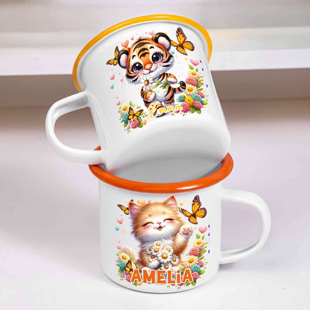This 12 oz enamel cup is cute and playful. The cup body is printed with 30 small animals such as rabbits, monkeys, bears, etc. holding wild flowers in flowers, and provides 3 fonts and 8 fonts of the name color to choose from. The cup mouth is designed with 6 macaron colors, which are deeply loved by children.