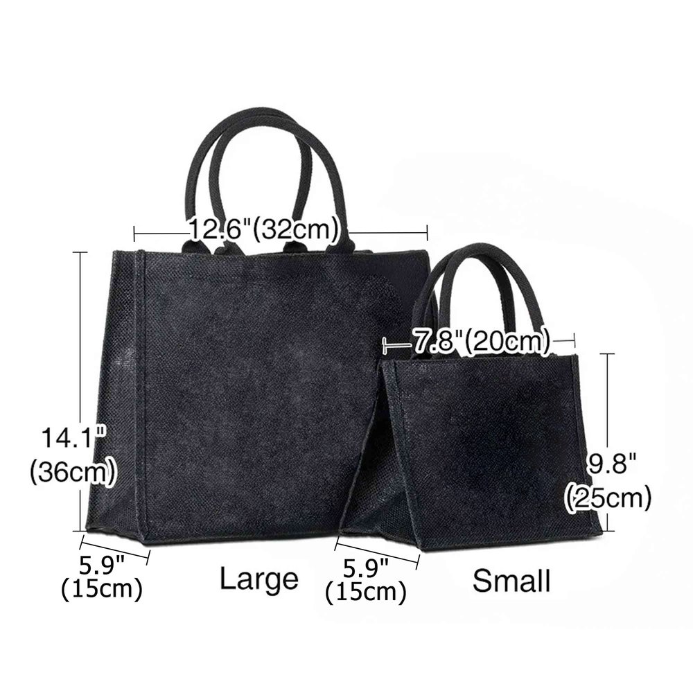 | Measurement: | Small Jute Tote - 10.2" Γ 10.2" Γ 6.7"(26cm Γ 26cm Γ 17cm) Medium Jute Tote - 13.7" Γ 7.8" Γ 11.8"(35cm Γ 20cm Γ 30cm) Large Jute Tote - 18.11" Γ 8.66" Γ 14.57"(46cm Γ 22cm Γ 37cm) Small Black Linen Tote - 9.8" Γ 7.8" Γ 5.9"(25cm Γ 20cm Γ 15cm) Large Black Linen Tote - 14.1" Γ 12.6" Γ 5.9"(36cm Γ 32cm Γ 15cm) |