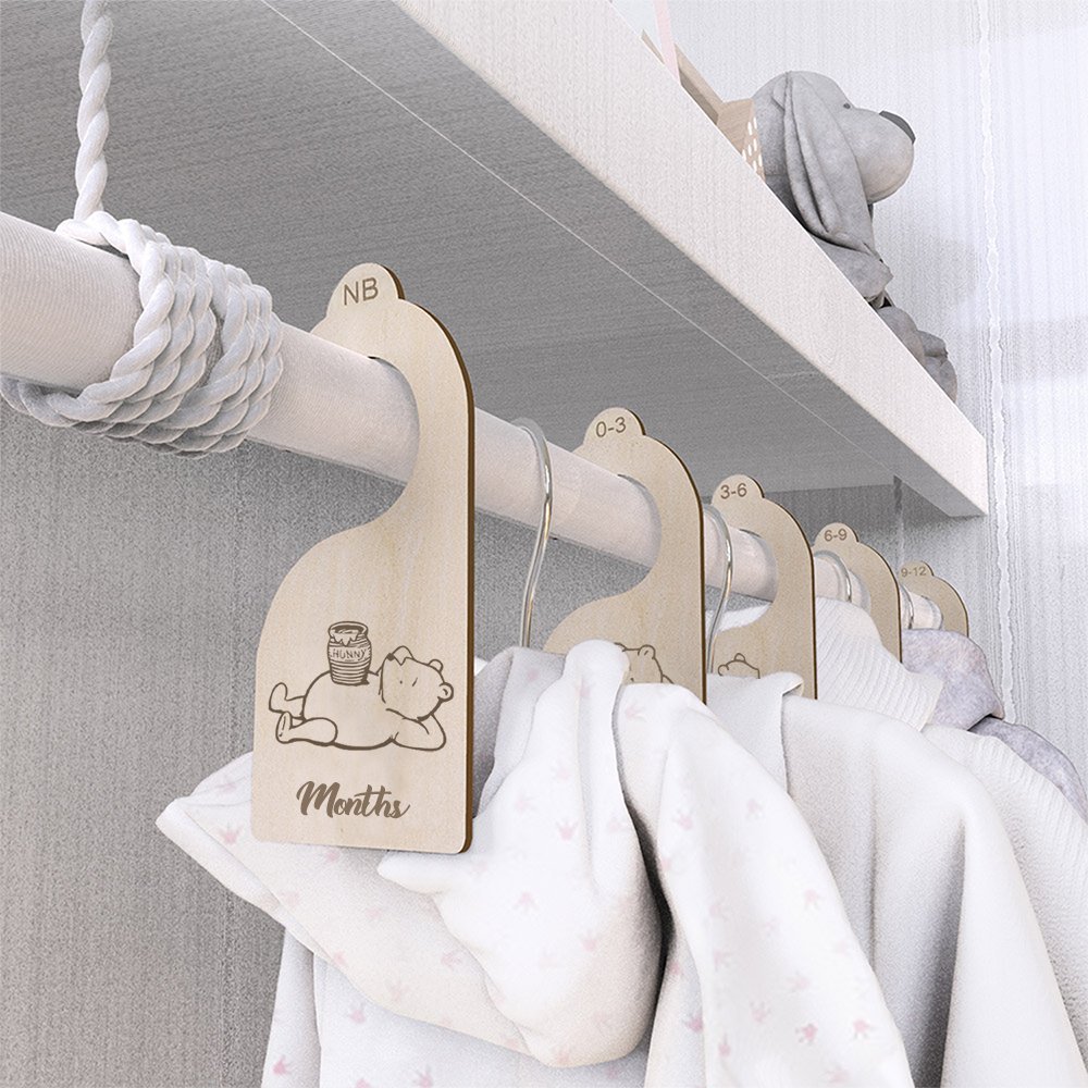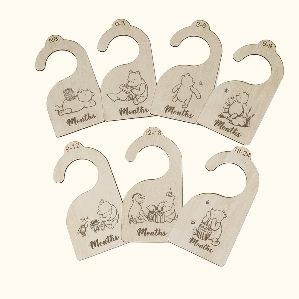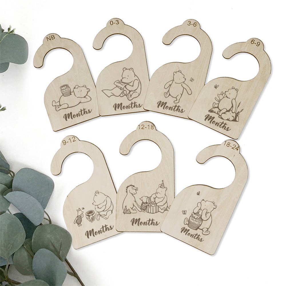 These sophisticated hangers take away the mess and stress of organizing your little one's ever-changing closet and help create a neat and orderly system that is cute and supports a little family business! If you want to feel organized and ready for baby, the wood nursery closet divider hangers are for you. 7 dividers for newborns, 0-3 months, 3-6 months, 6-9 months, 9-12 months, 12-18 months, 18-24 months. And you are all set for your little one to grow size by size.
