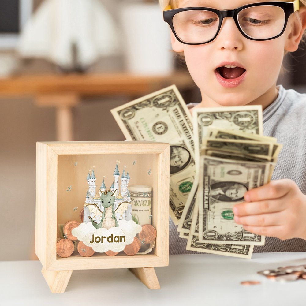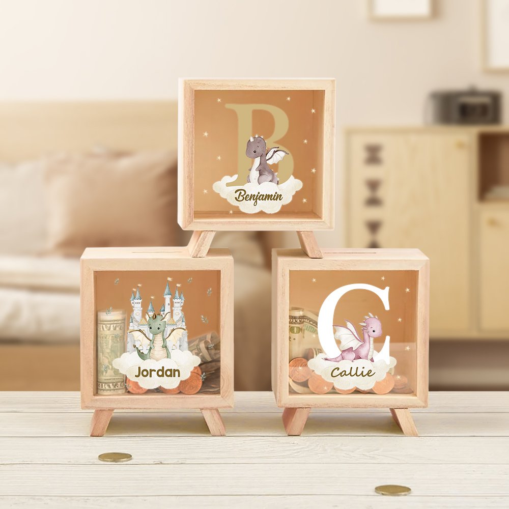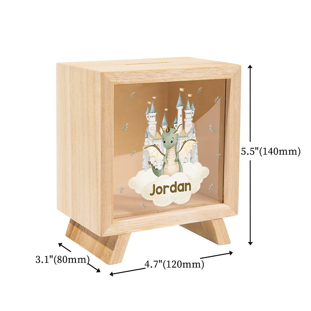 Personalized Cartoon Dragon Castle Initial Wood Clear Money Box Piggy Bank with Name Birthday for Kids