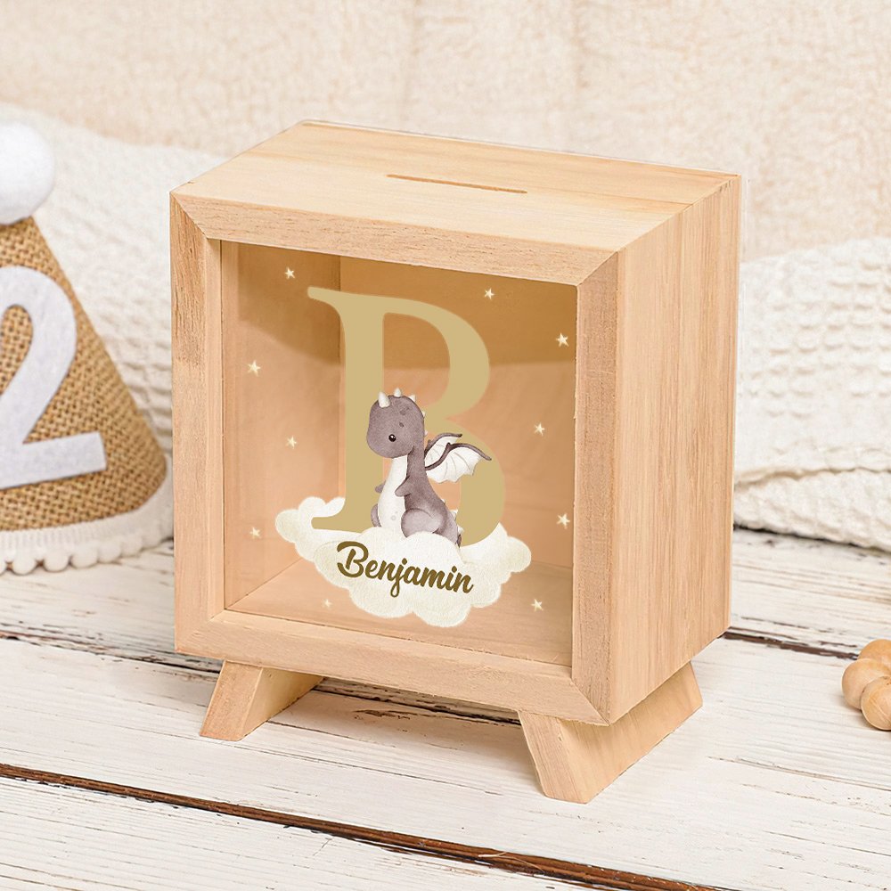 This charming wooden piggy bank features a delightful cartoon dragon and can be customized with either a castle design or the child's initials. By adding the child's name, this money box becomes a playful and personalized treasure for their savings journey.