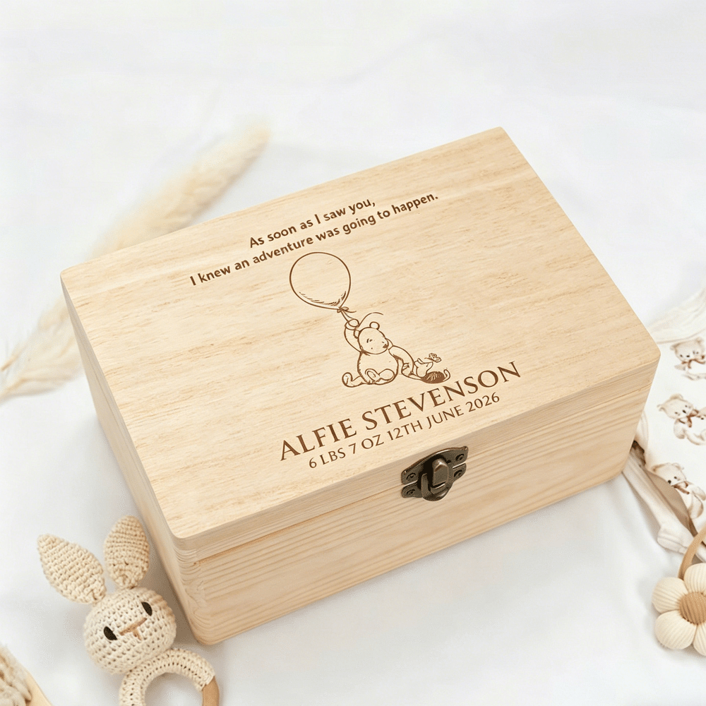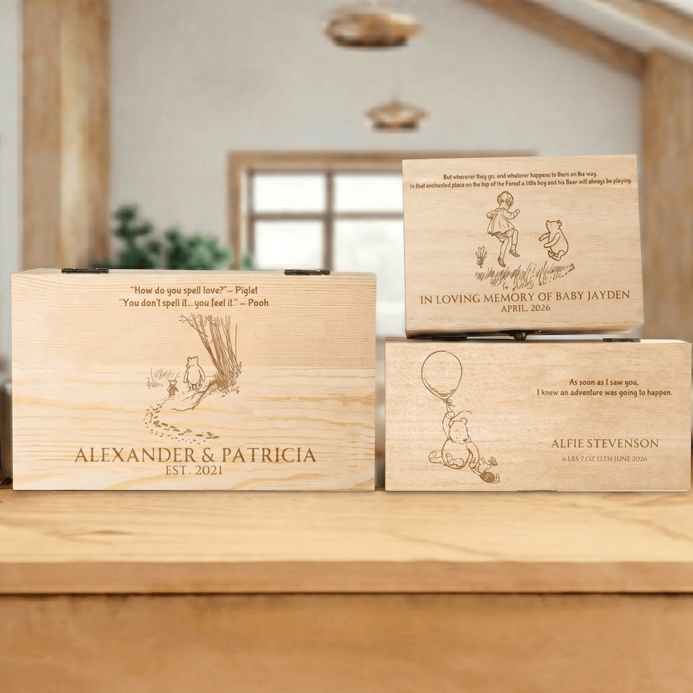 This deeply sentimental custom box makes an incredibly thoughtful gift for every milestone and life moment. It is perfect for new parents, grieving loved ones, lifelong classic Pooh fans, romantic couples, and close family and friends. Ideal for baby baptisms, remembrance and grief support, weddings, anniversaries, birthdays, and Christmas celebrations, it carries far more warmth and quiet affection than ordinary generic gifts.