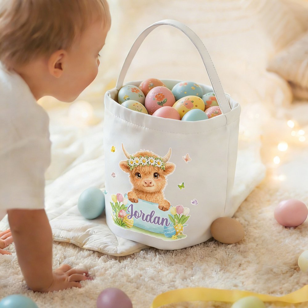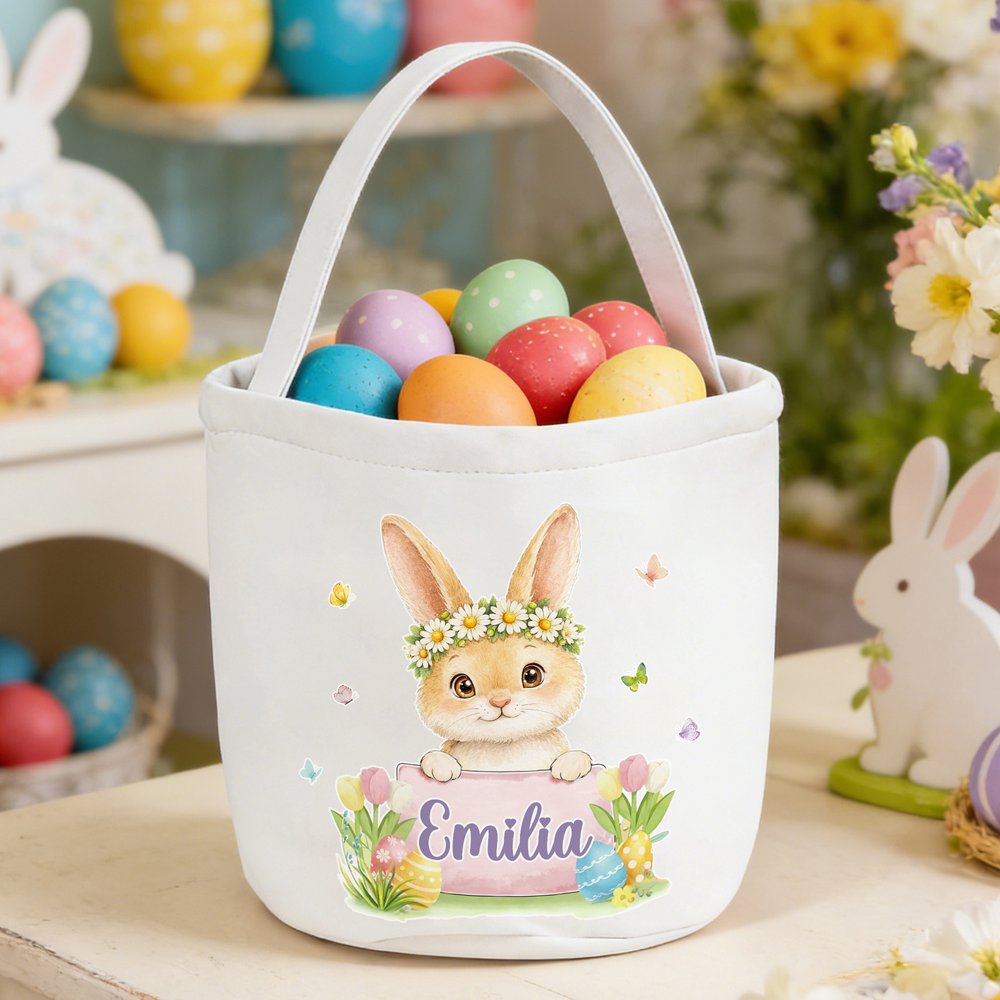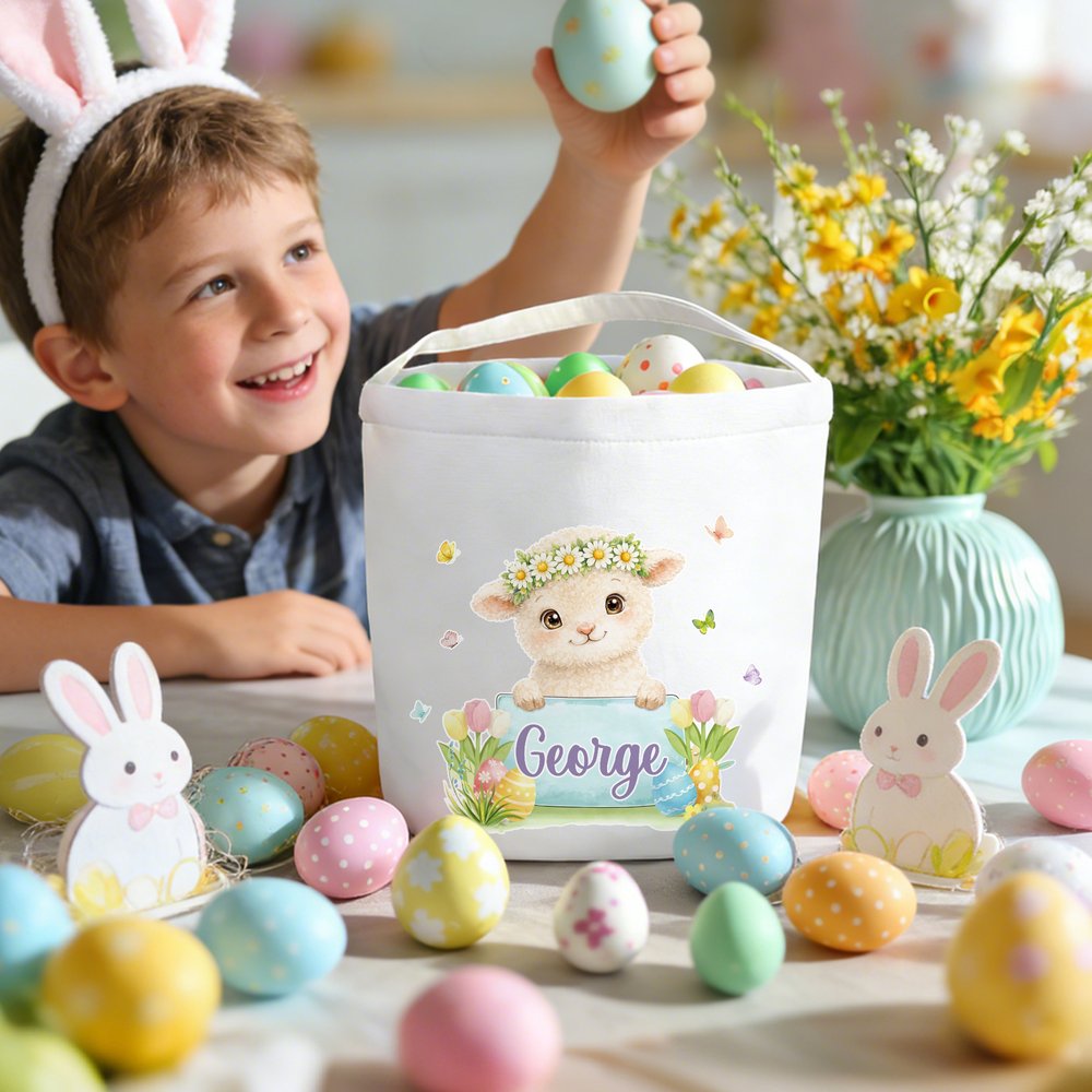 Visually, the basket has a soft, whimsical style. Its white canvas base features a watercolor-style animal (adorned with a daisy wreath) peeking over a colored name plate, with delicate butterflies, tulips, and Easter eggs as accents. The gentle pastel palette and cute illustrations blend spring charm with personalization, creating a basket that’s both functional and full of Easter’s cheerful spirit.