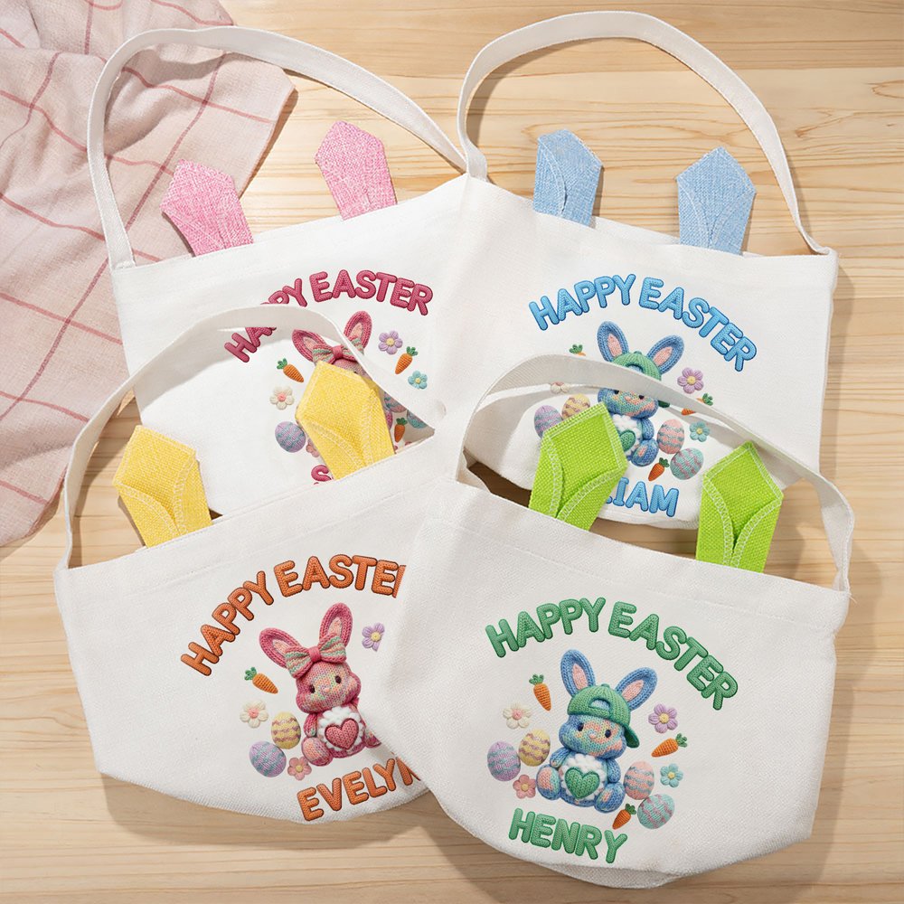 Personalized Yarn Crocheted Effect Cute Rabbit Name Linen Bucket Basket with Bunny Ears Easter Egg Hunting Easter Party Favors Gift for Kids