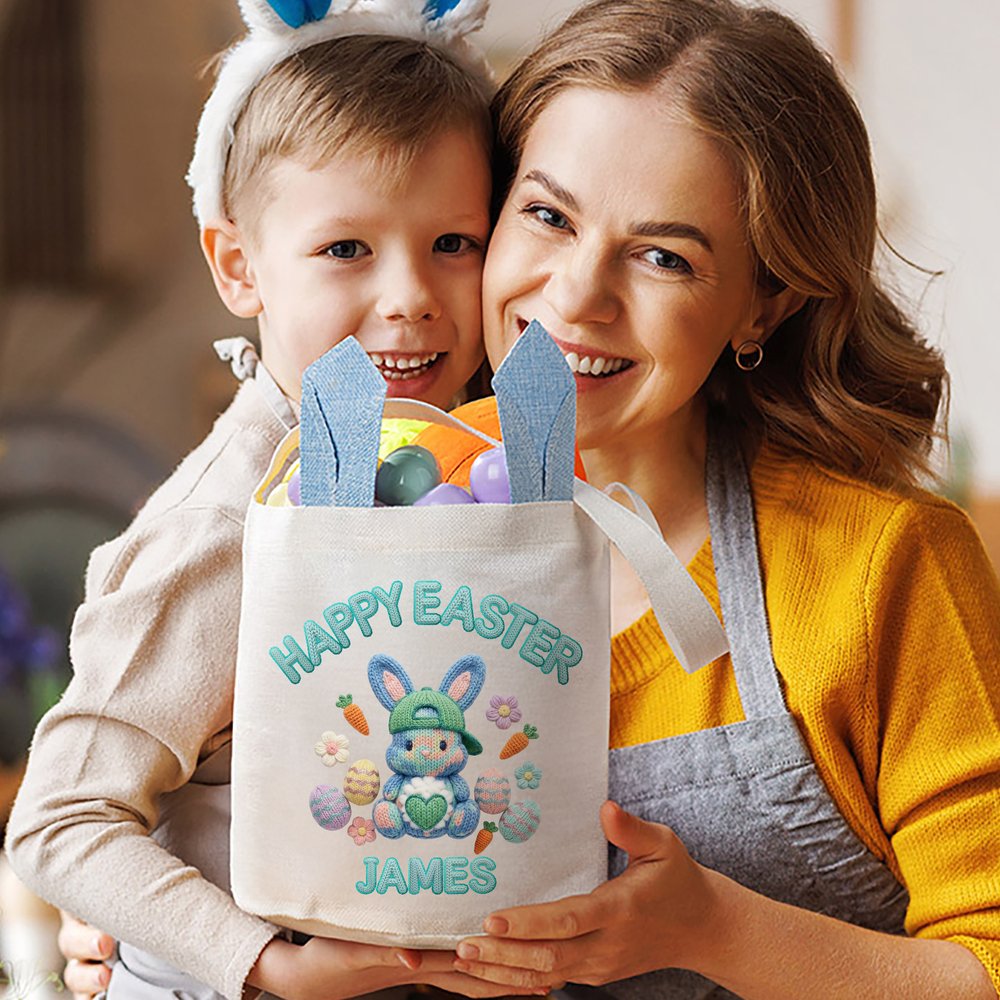 This charming Easter basket is the perfect addition to your holiday celebrations, adorned with two eye-catching bunny ears that add a playful and adorable touch. The front of the basket features a cute bunny surrounded by elements such as Easter eggs, carrots, and flowers, with a crocheted design effect that perfectly captures the innocence and joy of the holiday. The "HAPPY EASTER" lettering at the top, along with the option to customize a name below, makes it even more unique and memorable.