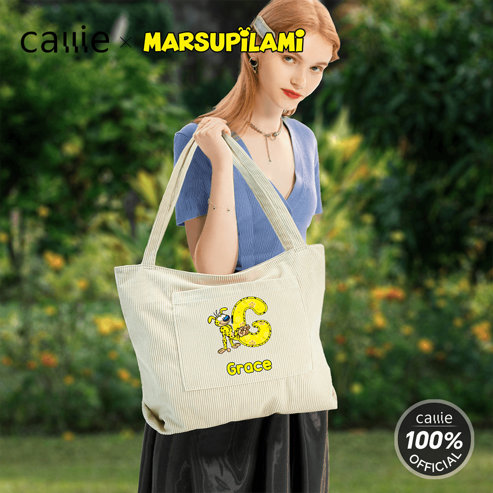Personalized Yellow-Spotted Leopard Marsupilami Leisure Corduroy Tote Bag with Name Birthday Gift for Friends Kids | Callie × Marsupilami®