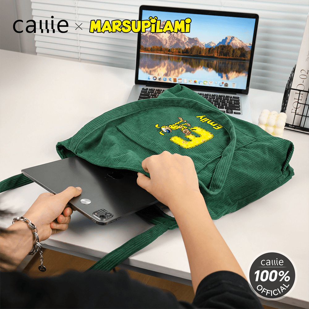 You can choose the cute cartoon image pattern of Tail-Bouncing Matthew, which was created by Belgian cartoonist André Franquin in 1952. Marsupilami is a jungle-dwelling creature with yellow fur, black spots, and a super flexible, long tail. This corduroy tote bag also supports name customization, making it a personalized everyday item.