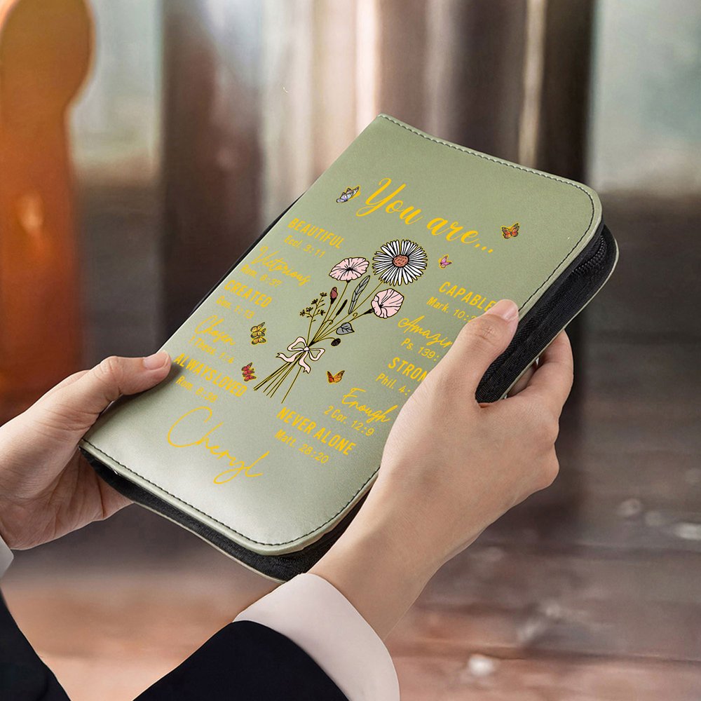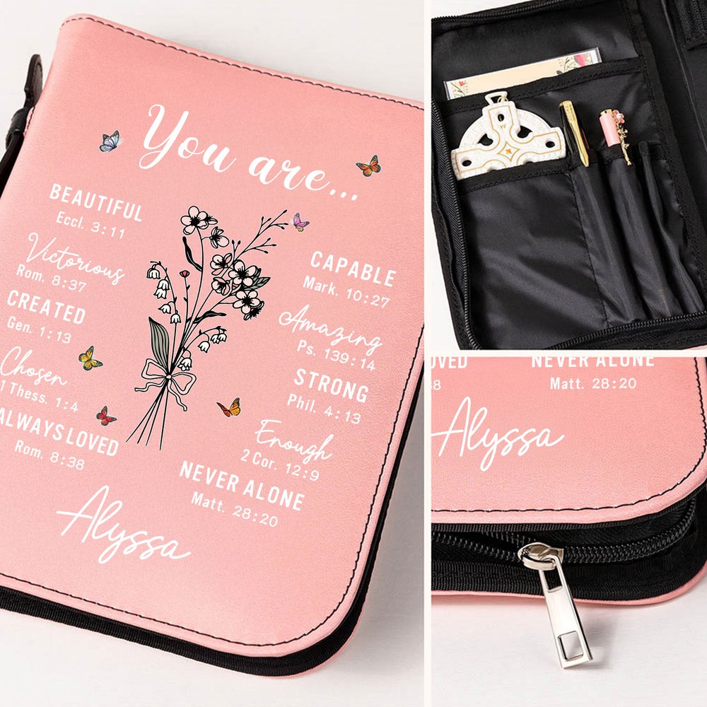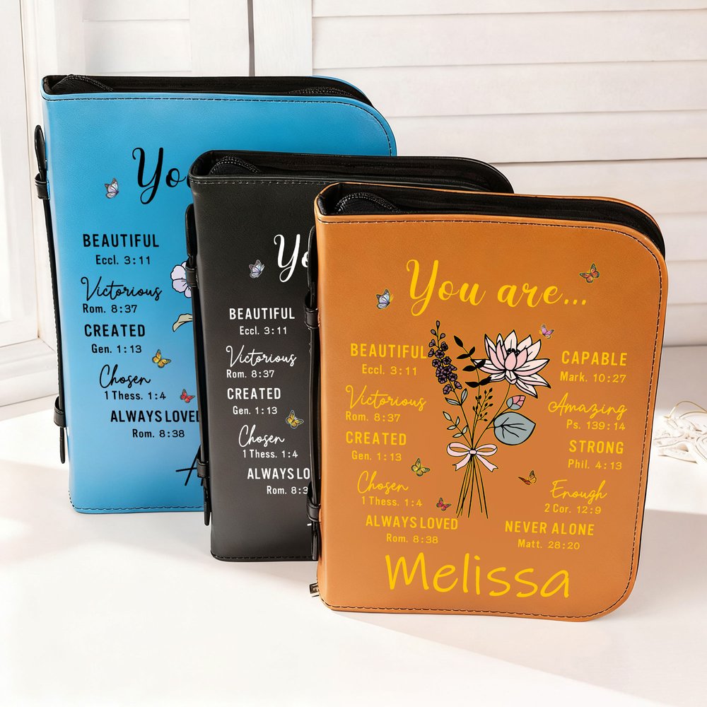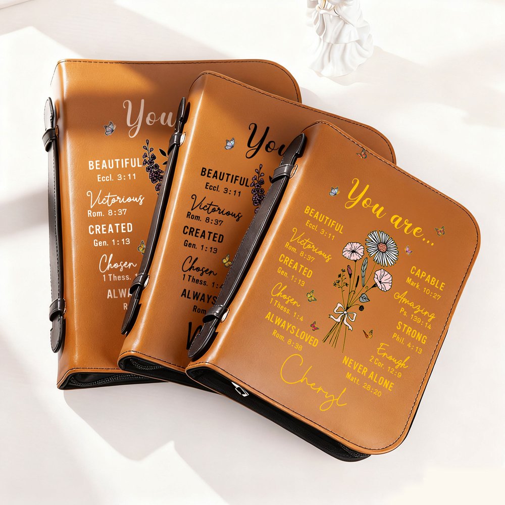 This Bible cover features the heartwarming declaration "You Are…" on the cover, paired with Scripture verses and a birth flower bouquet design—a creation filled with the warmth of faith. Customizable with a name, it becomes a unique keepsake. The exquisite design reflects the tenderness of belief while holding a deeply personal touch, transforming Bible storage into a meaningful ritual.