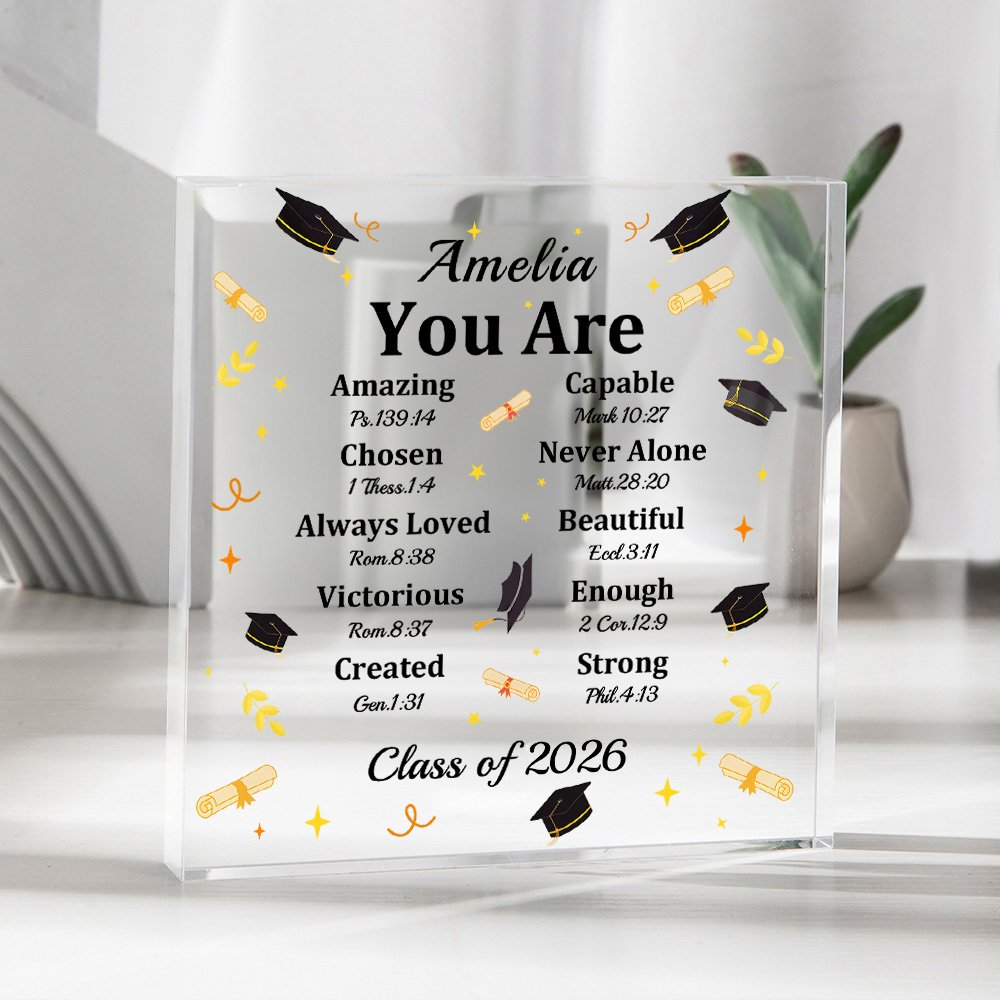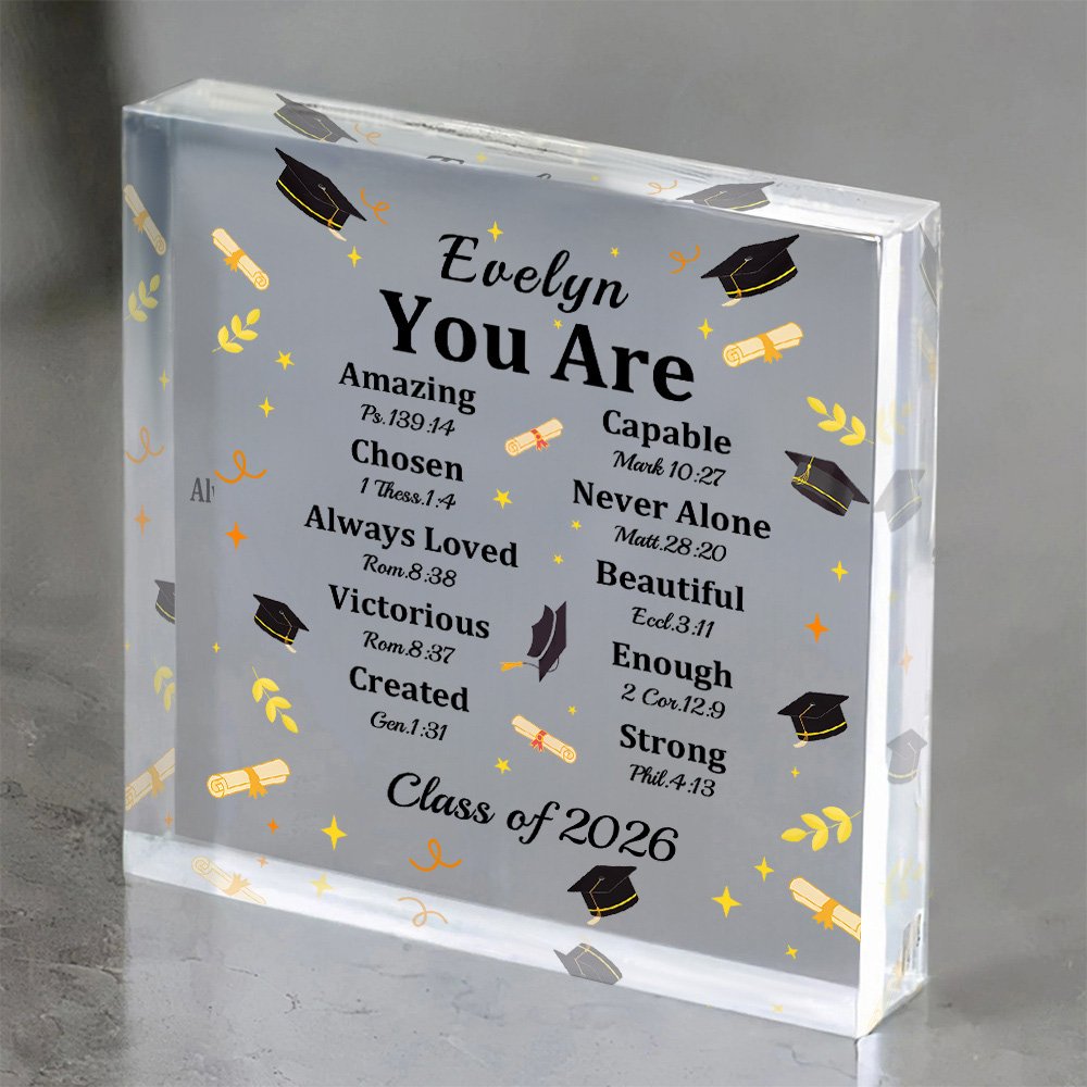 Celebrate a milestone achievement with this beautifully designed acrylic plaque featuring graduation caps, inspiring Bible chapters, and a customizable name and year. Itβs a touching way to honor a graduate's hard work while reminding them of their faith and future potential.