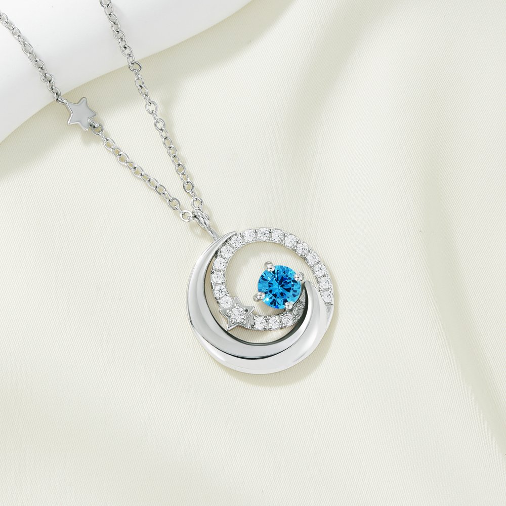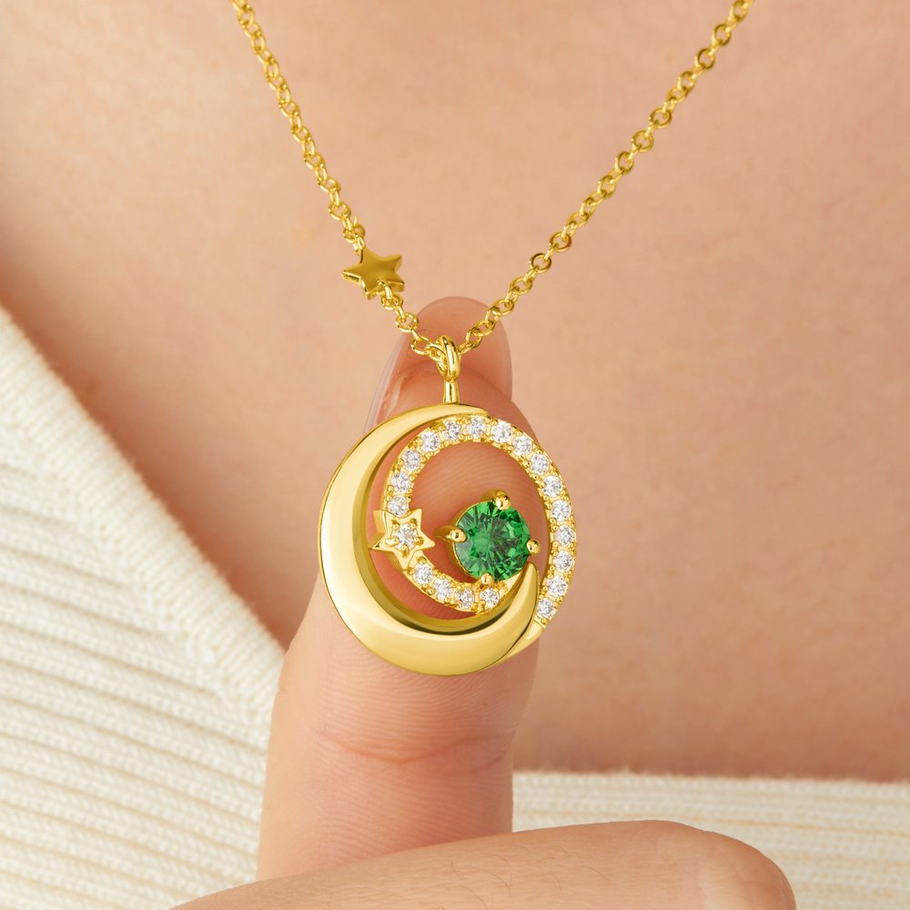 Featuring the classic moon and stars as core elements, this delicate pendant necklace features a round birthstone set at its heart, which adds a vibrant sparkle and highlights the fine texture of the piece. The clean, flowing lines enhance its elegant profile, making the simple design memorable and effortlessly stylish.