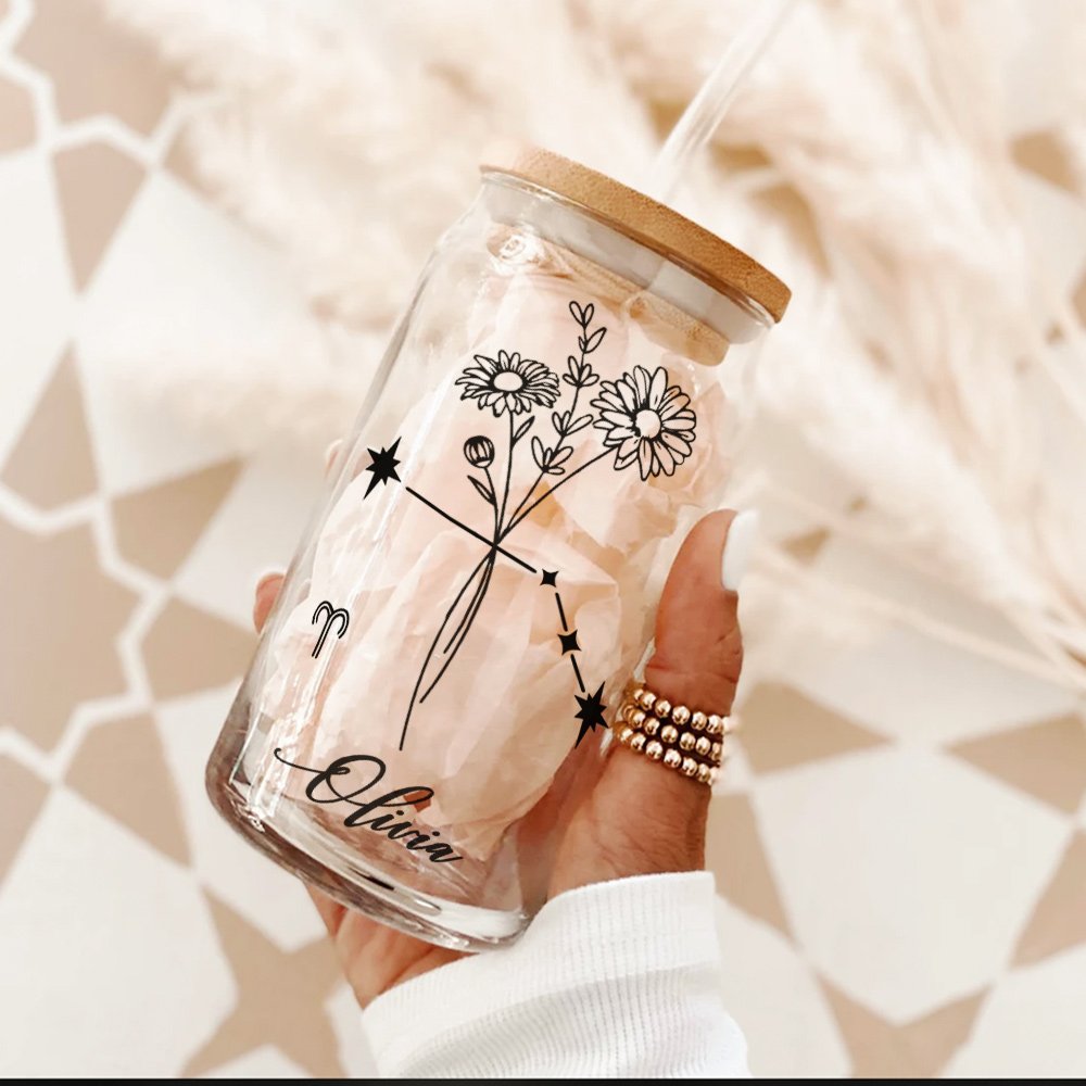 Using the birth flower and zodiac as design elements, you can pick your own or the recipient's birth flower and zodiac, with a personalized name to create a unique can tumbler glass.