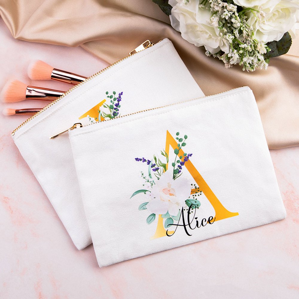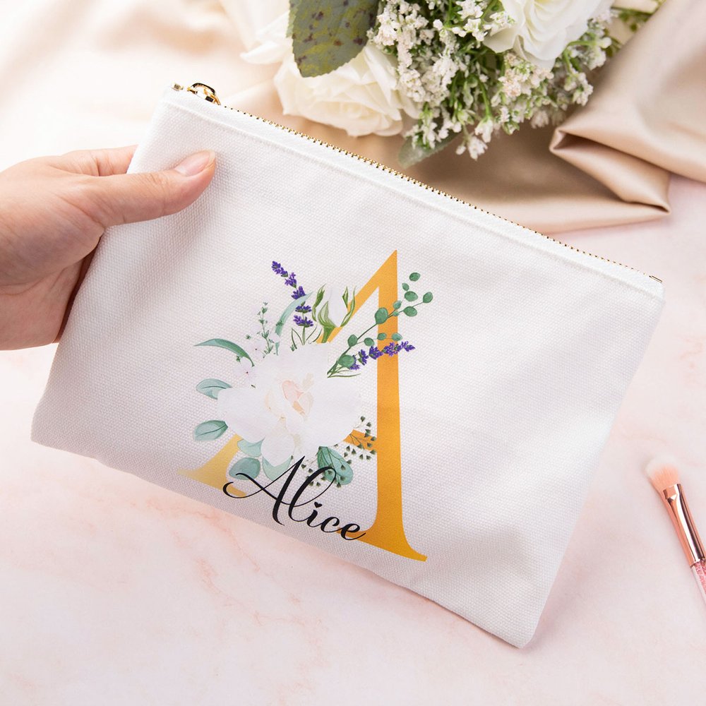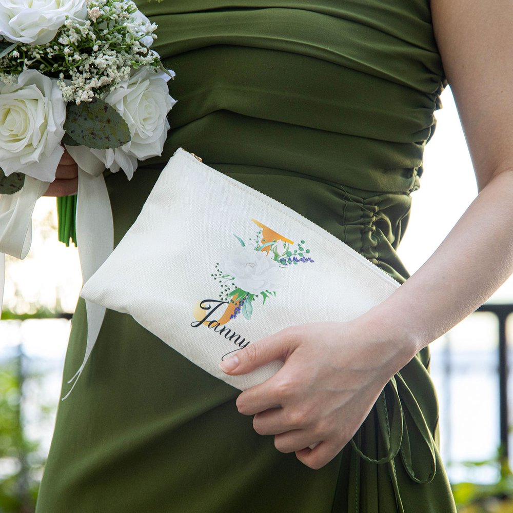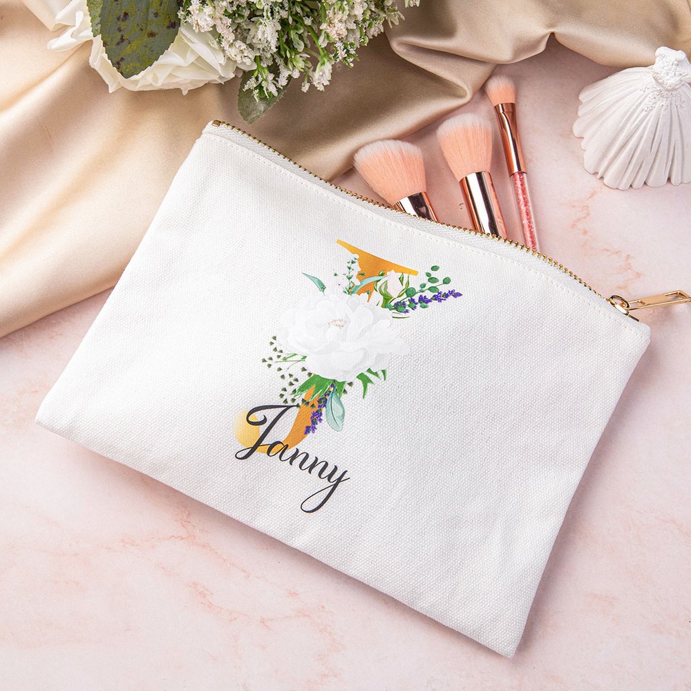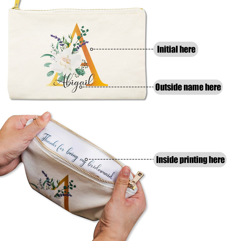 The name can be customized on the outer layer of the cosmetic bag. In the middle of this makeup bag, there is a golden capital initial with flowers. When the bridesmaids open the bag, they will see the words that the bride left to express gratitude to the bridesmaids. And it is suitable to be carried at any time on the day of the wedding, which is very convenient.