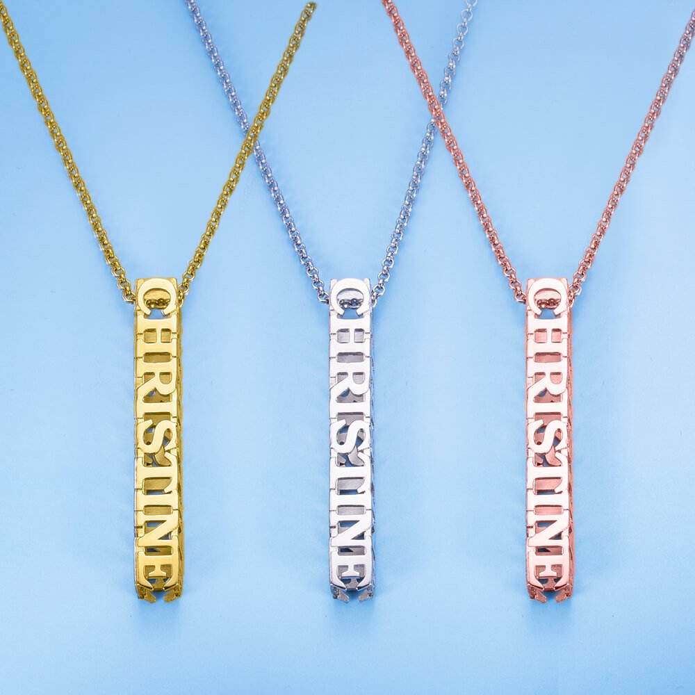 β’The fashion modern style name bar necklace by Callie is conveying the meaning of confidence and individuality. The hanging direction can be decided by yourself. Bars cuts refract the incoming light brightly. This dainty necklace shows the stereoscopic bar with the unique name. The simple but stylish design of bars indicates the significance of special words or names for the wearer. Girls are going to love it as it suits effortlessly for all kinds of occasions while it remains unique.