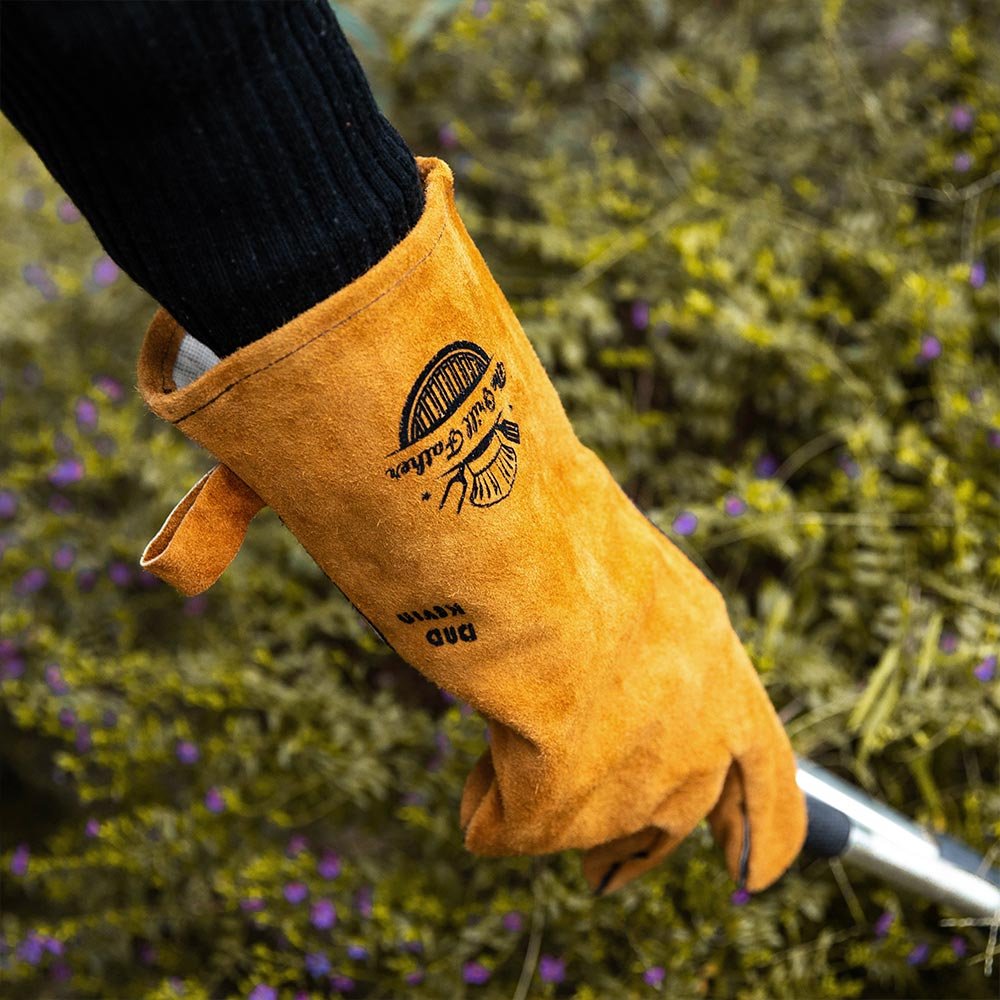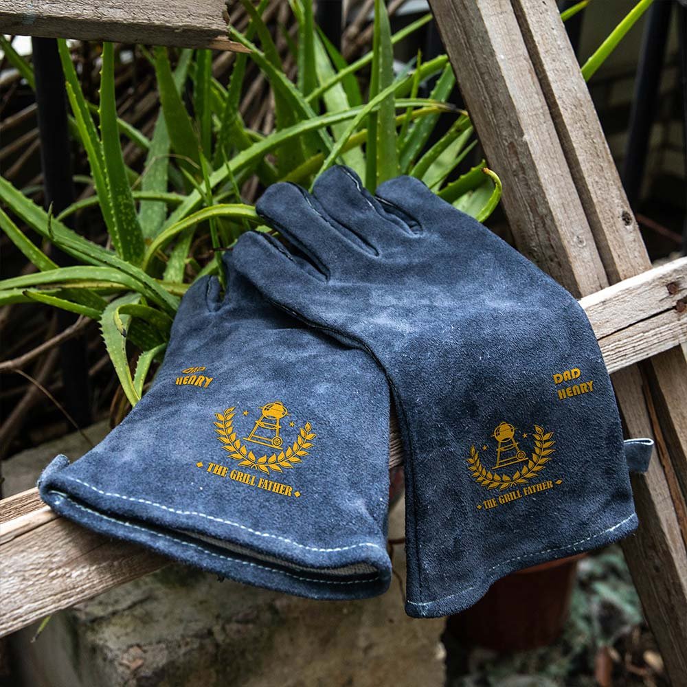 The BBQ gloves combine style and functionality, featuring the playful phrase "THE GRILL FATHER." Available in four distinctive designs, these gloves can be customized with your dad's name, making them a one-of-a-kind gift that showcases his personality while he cooks up a storm.